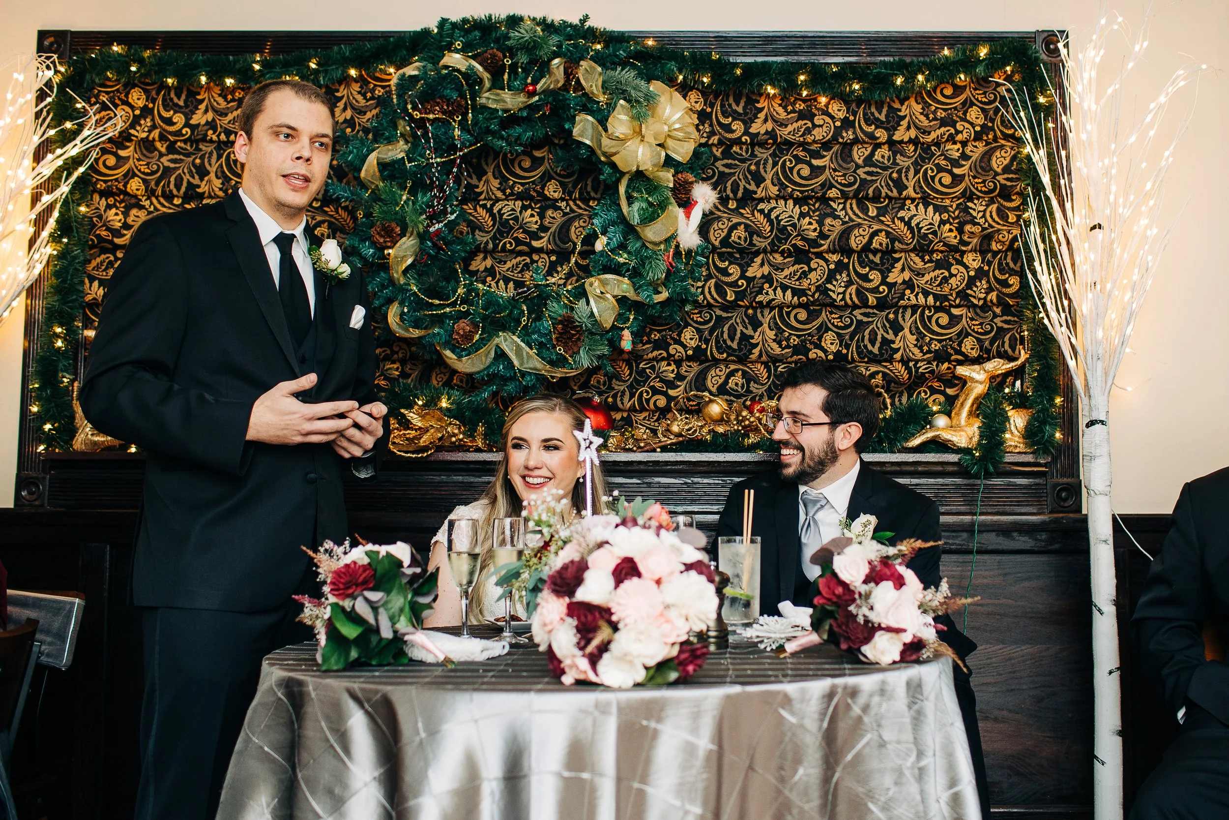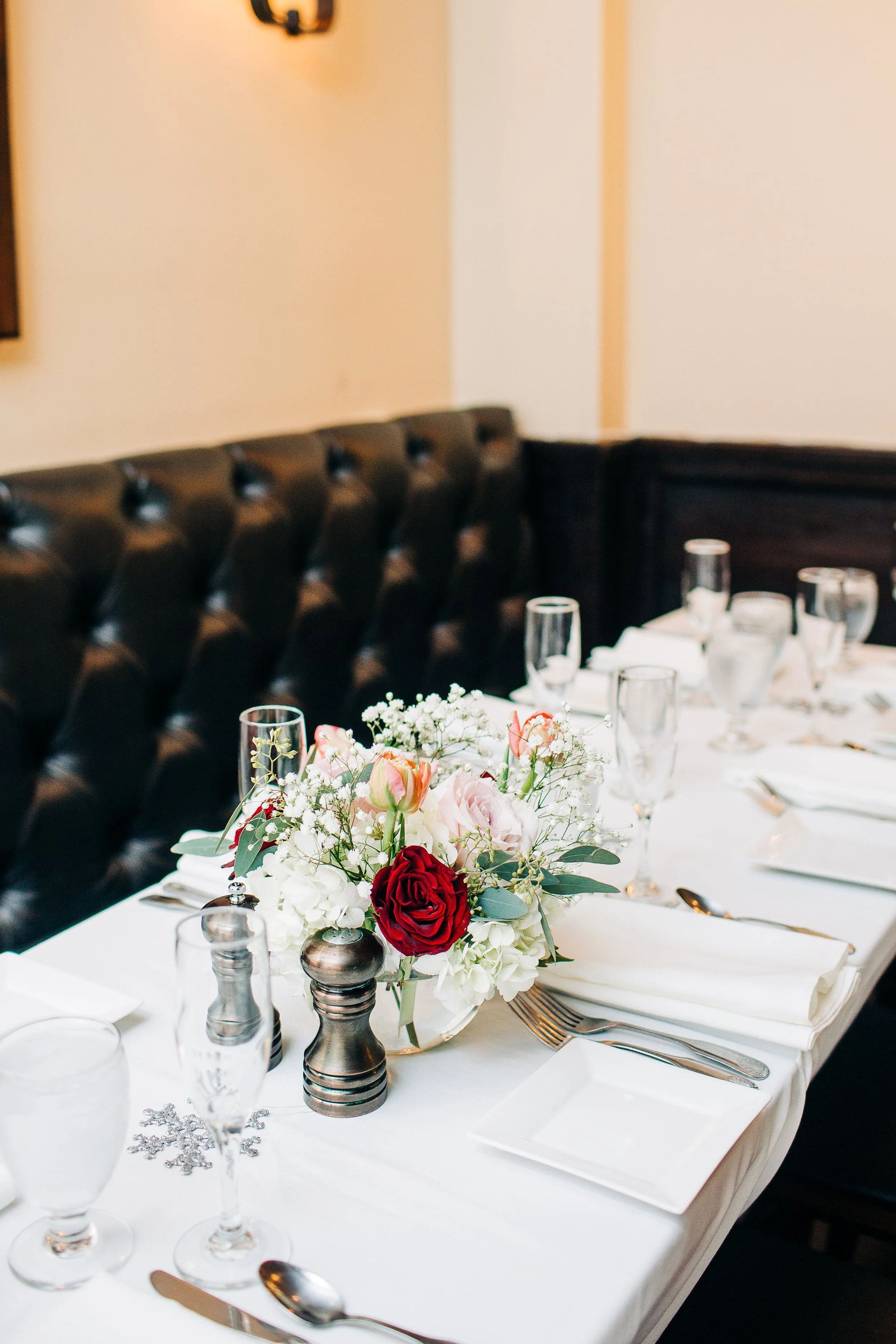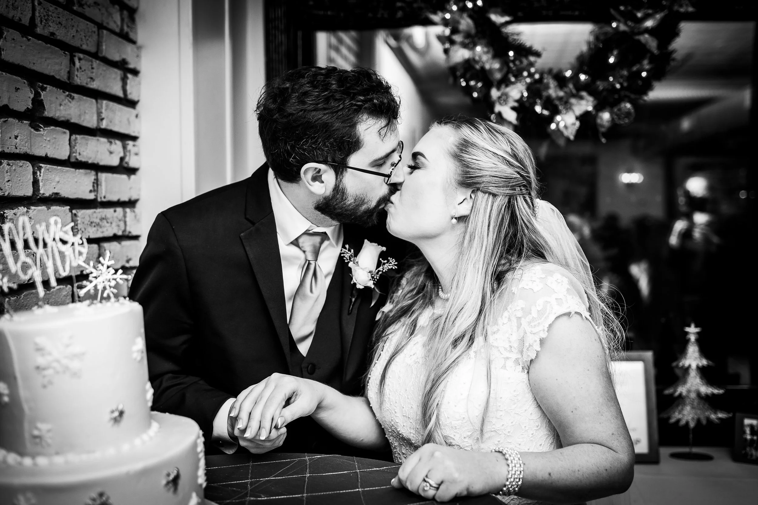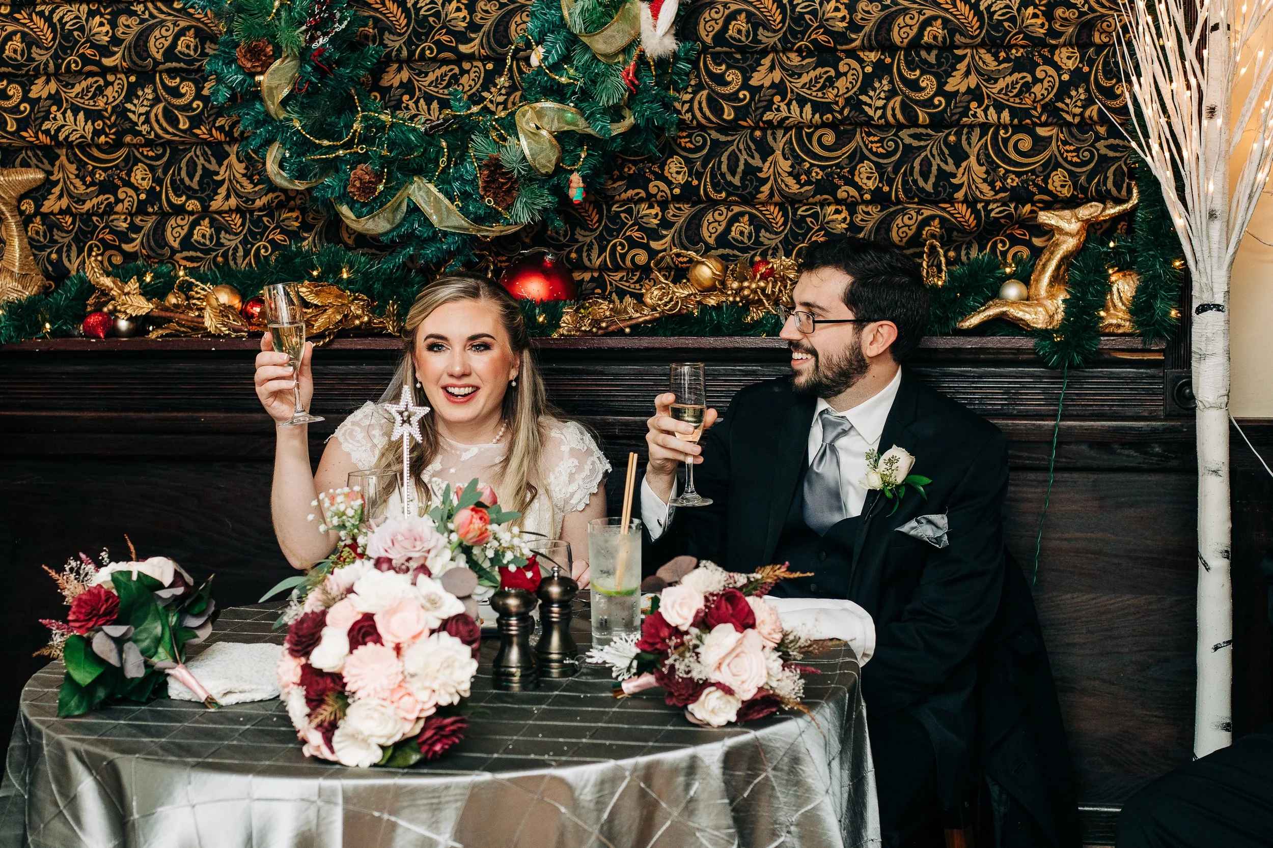 Bre and Luke opted for a wintery theme, with a few nods to the Christmas season. Their ceremony space was already decorated for Christmas, so they ran with it. They had beautiful red, white, and blush pink florals, and a snowflake motif for their reception decor. Bre also wore a tea-length wedding gown accompanied by a fur stole to keep her warm - a wardrobe choice that was so cute and unique (and which also proved efficient, as we didn’t need to worry about dragging a wedding gown train on the wet ground that day!).