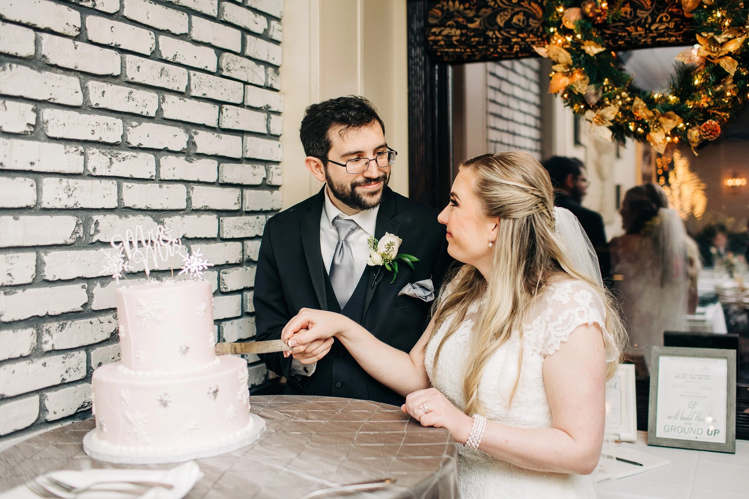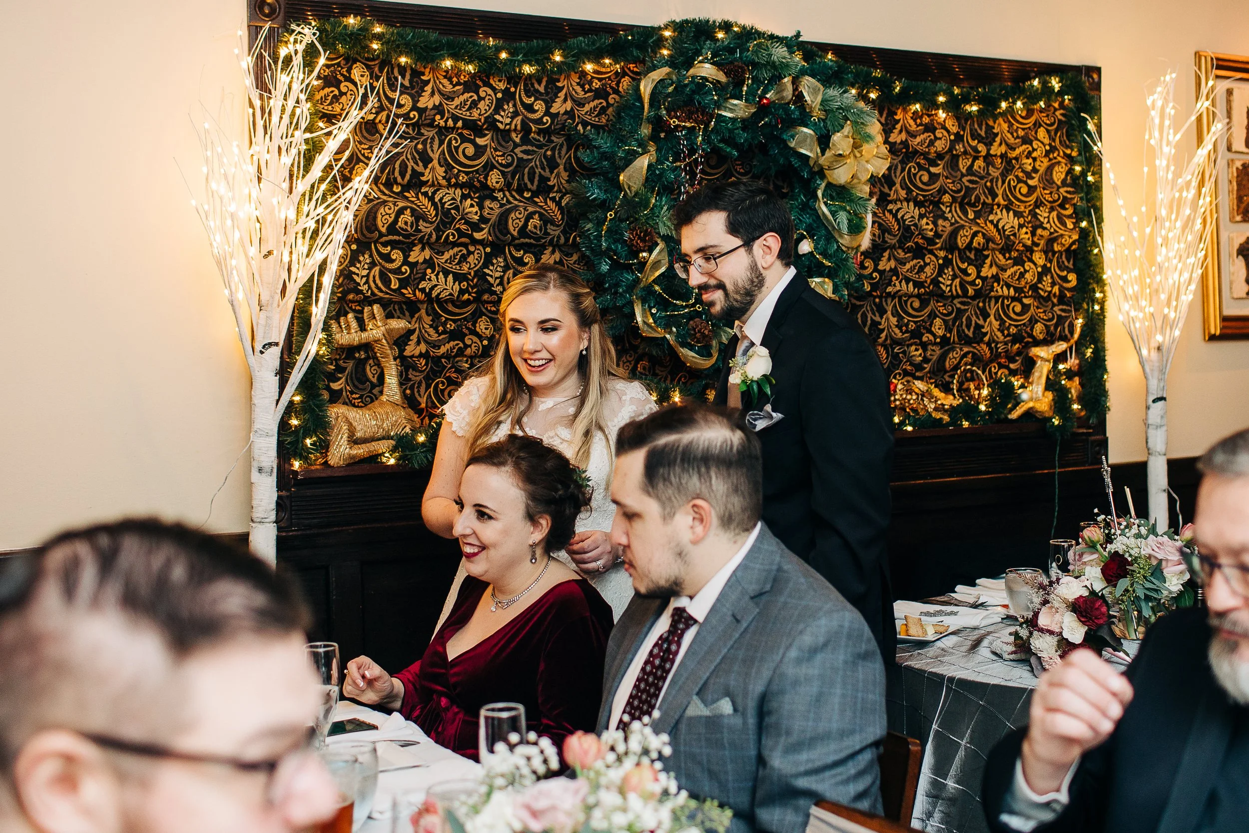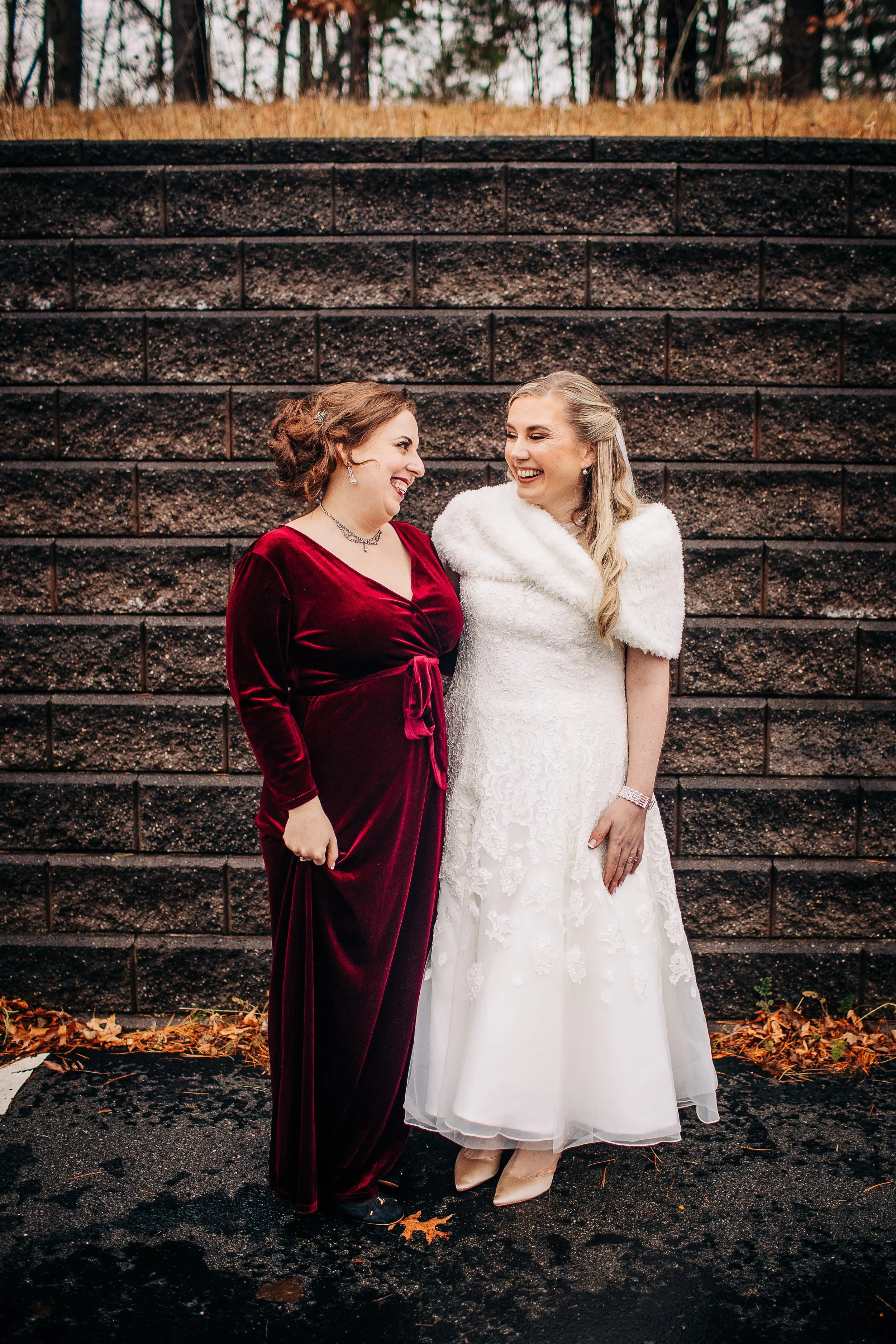 Bre and Luke opted for a wintery theme, with a few nods to the Christmas season. Their ceremony space was already decorated for Christmas, so they ran with it. They had beautiful red, white, and blush pink florals, and a snowflake motif for their reception decor. Bre also wore a tea-length wedding gown accompanied by a fur stole to keep her warm - a wardrobe choice that was so cute and unique (and which also proved efficient, as we didn’t need to worry about dragging a wedding gown train on the wet ground that day!).