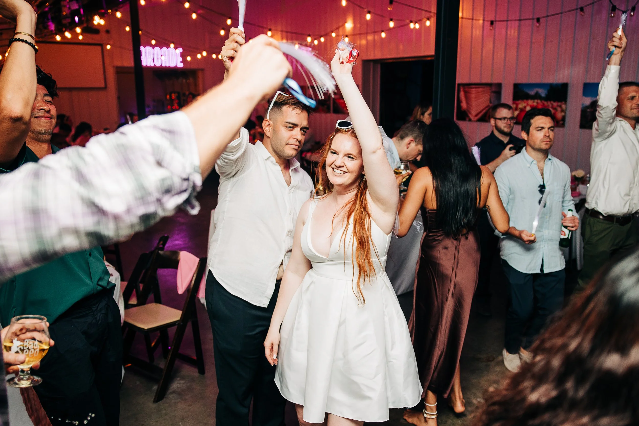 The reception is where the day really opened up. More guests joined to celebrate, the cider room glowed, and there was a taco truck. Honestly, a taco truck at a wedding is always a good decision, and the guests were very much on board. It set a tone that was festive and fun.