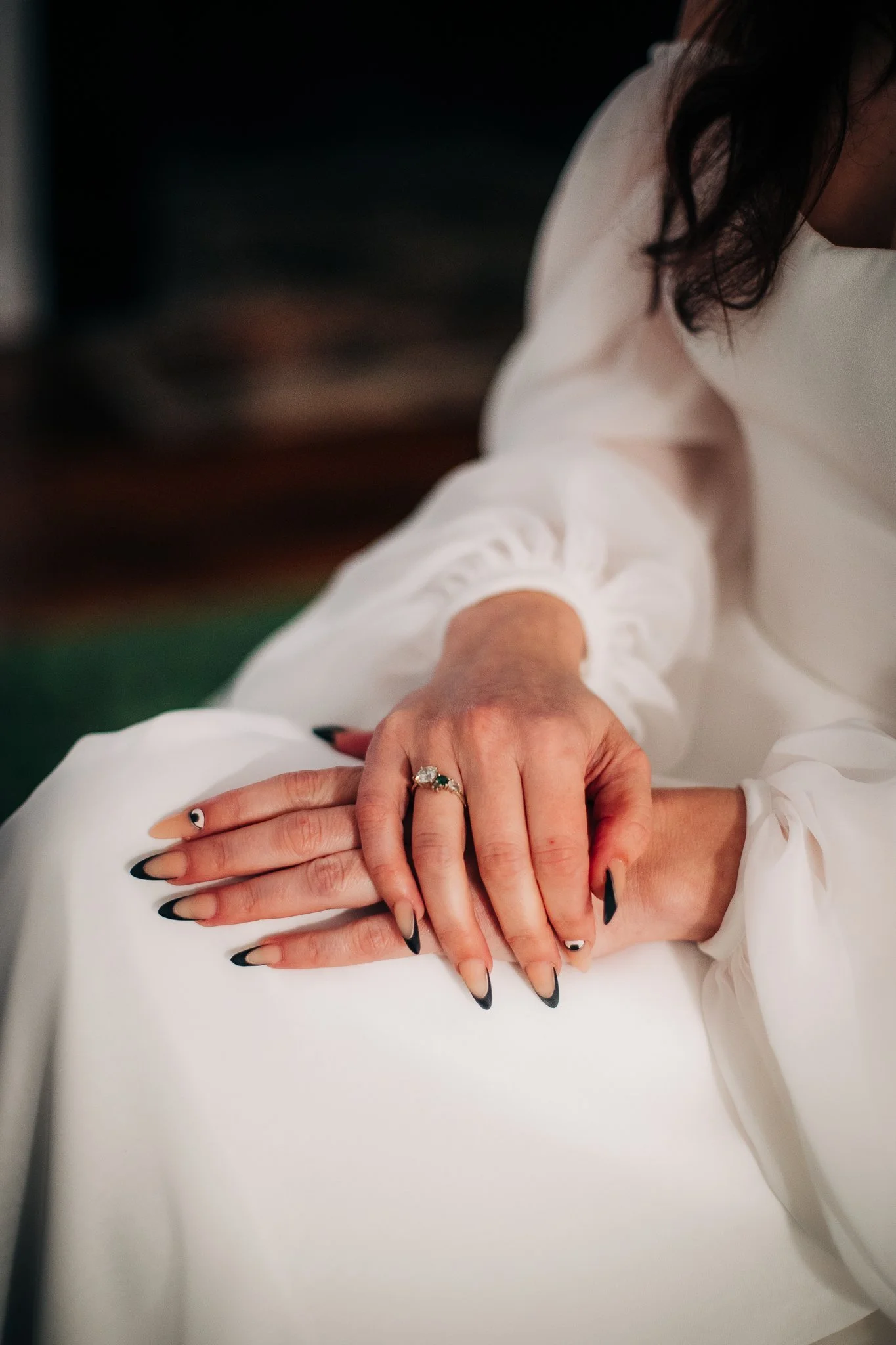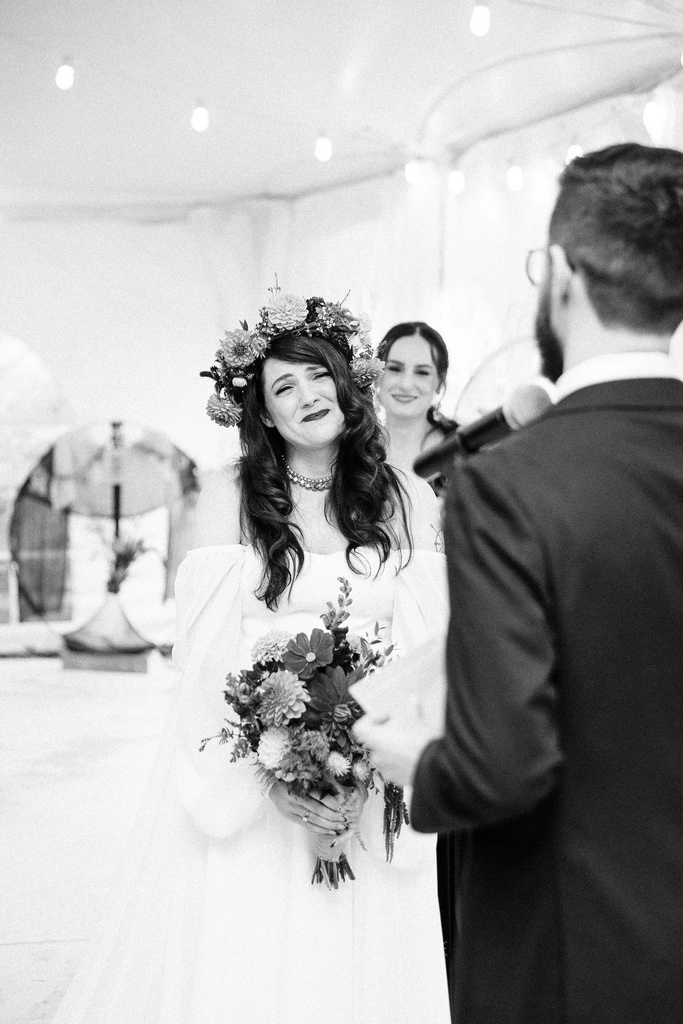 Ash wore a flowing gown, a flower crown in vibrant tones, and the most incredible shoes - adorned with the evil eye. She even had matching evil eye nail art, which I thought was so clever. Matt wore a sharp black suit with a tweed vest and a burgundy tie; it was classic with just enough of an edge to match the mood.