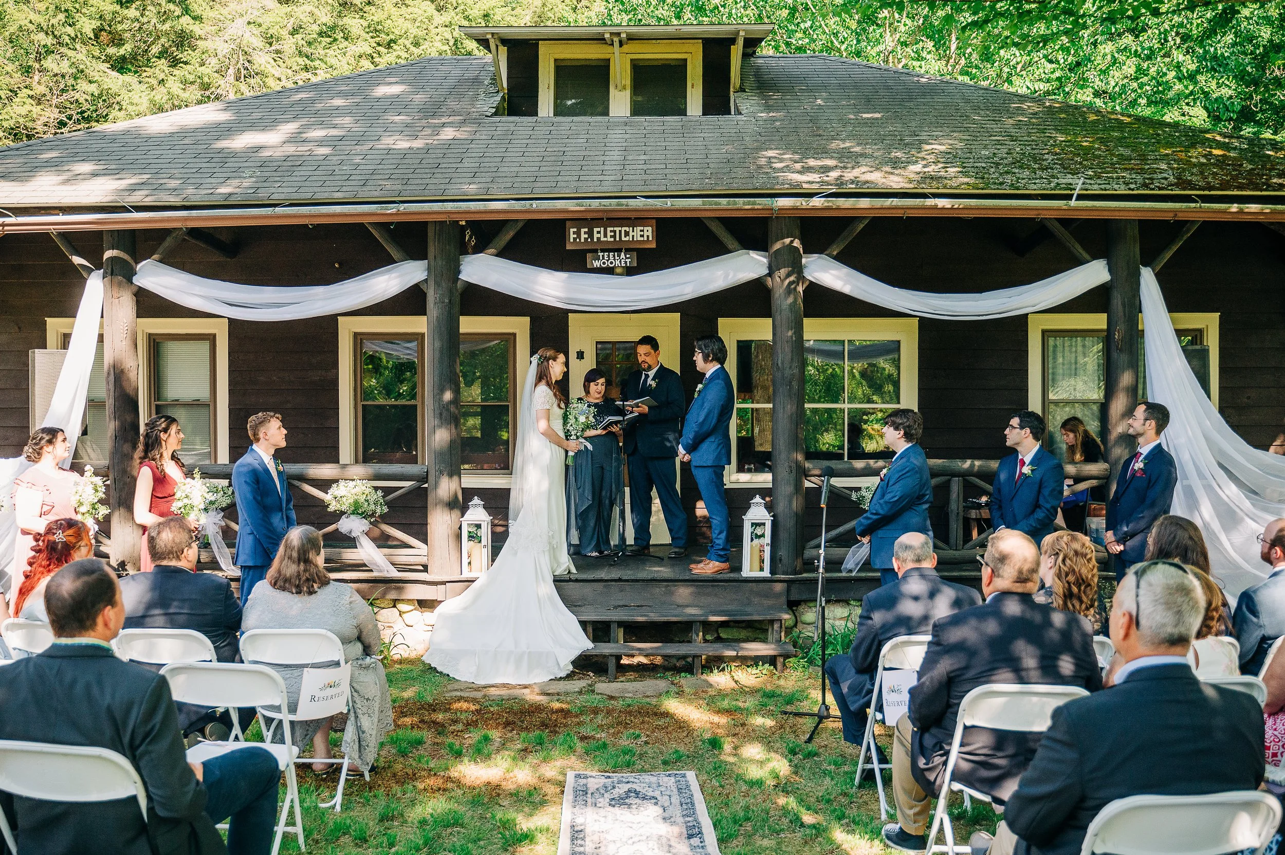 Scott and Lauren got married on the grounds of Lauren’s family’s Catskills estate. It was a sweet little space of about a block of land, including a beautiful open field by a stream for their tented reception, and cabins for both the backdrop of their ceremony and for the couple to get ready in. Lauren’s family took care of most of the set-up, and one aunt in particular said to me, “I think we’ve done about 5 of these weddings here now - we all know what we need to take care of.” It has become sort of a family tradition for the cousins to get married on this land. The family worked together like a well oiled machine, and the finished product was absolutely stunning.