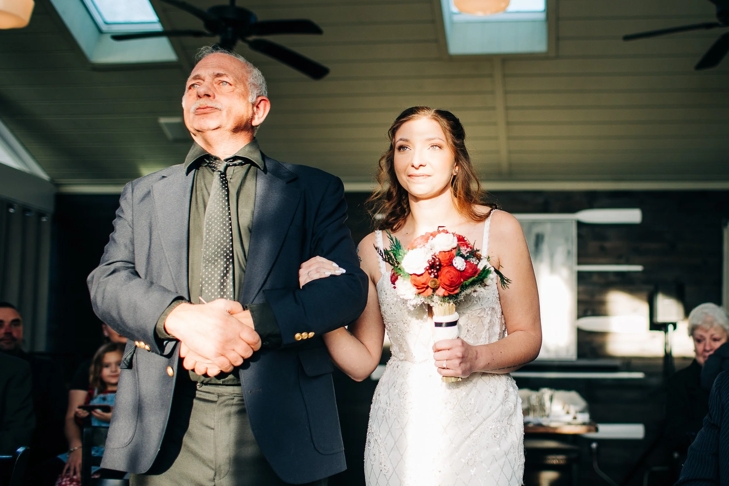 Copake Country Club in Craryville, NY is tucked away in a somewhat residential area, and just a dream of a venue. The indoor restaurant space (open to the public on most days) was perfect to host Katelyn and Nick’s microwedding, but the venue also boasts a large tent for bigger weddings in warmer weather. The grounds are beautiful, with rolling golf course hills, and a more rustic feel to the space, with gravel paths and lots of lovely trees, than a lot of other country clubs offer.