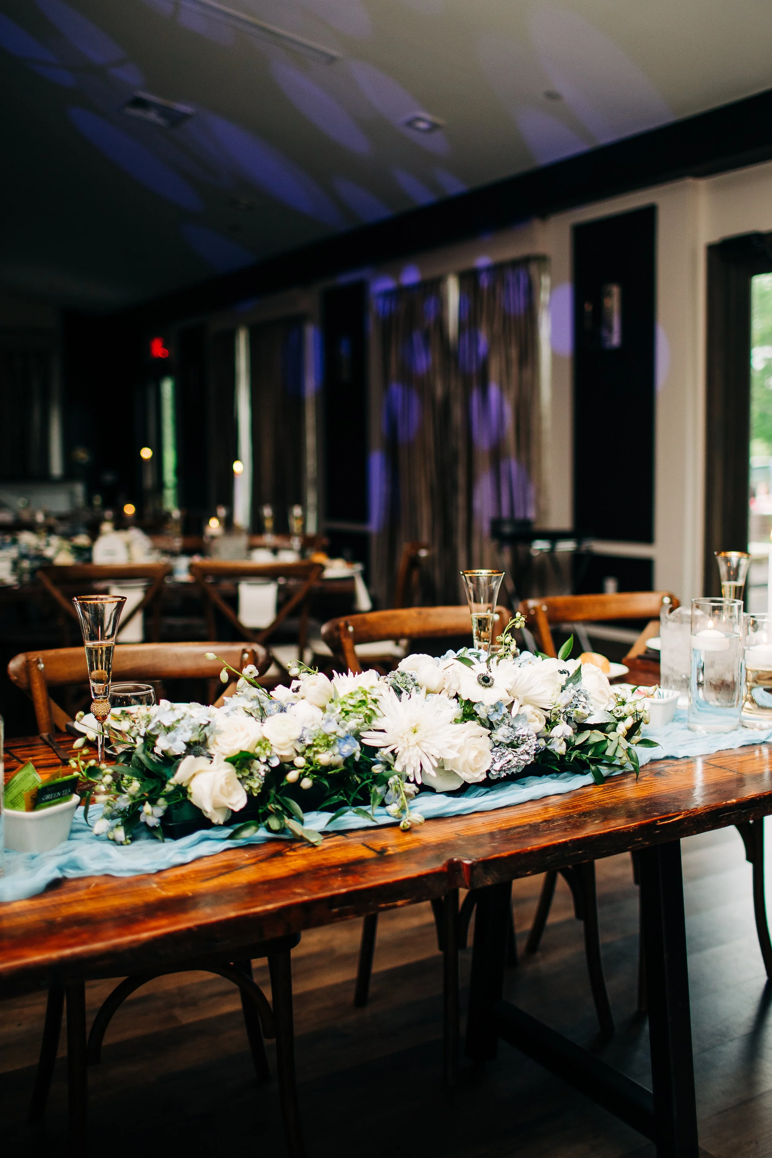 Kim had a clear vision from the start: baby blue as the main color, with light, airy, fresh springtime vibes. She wanted muted pastel colors in the flowers and to let spring itself do some of the decorating. The result was exactly that - soft, beautiful, seasonally perfect.