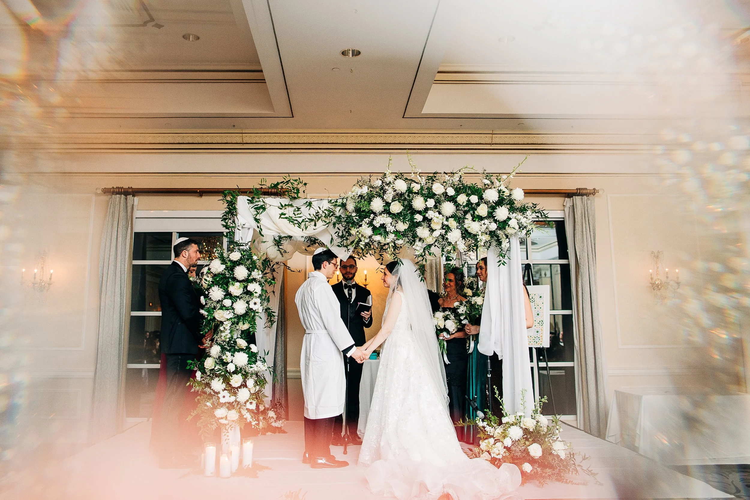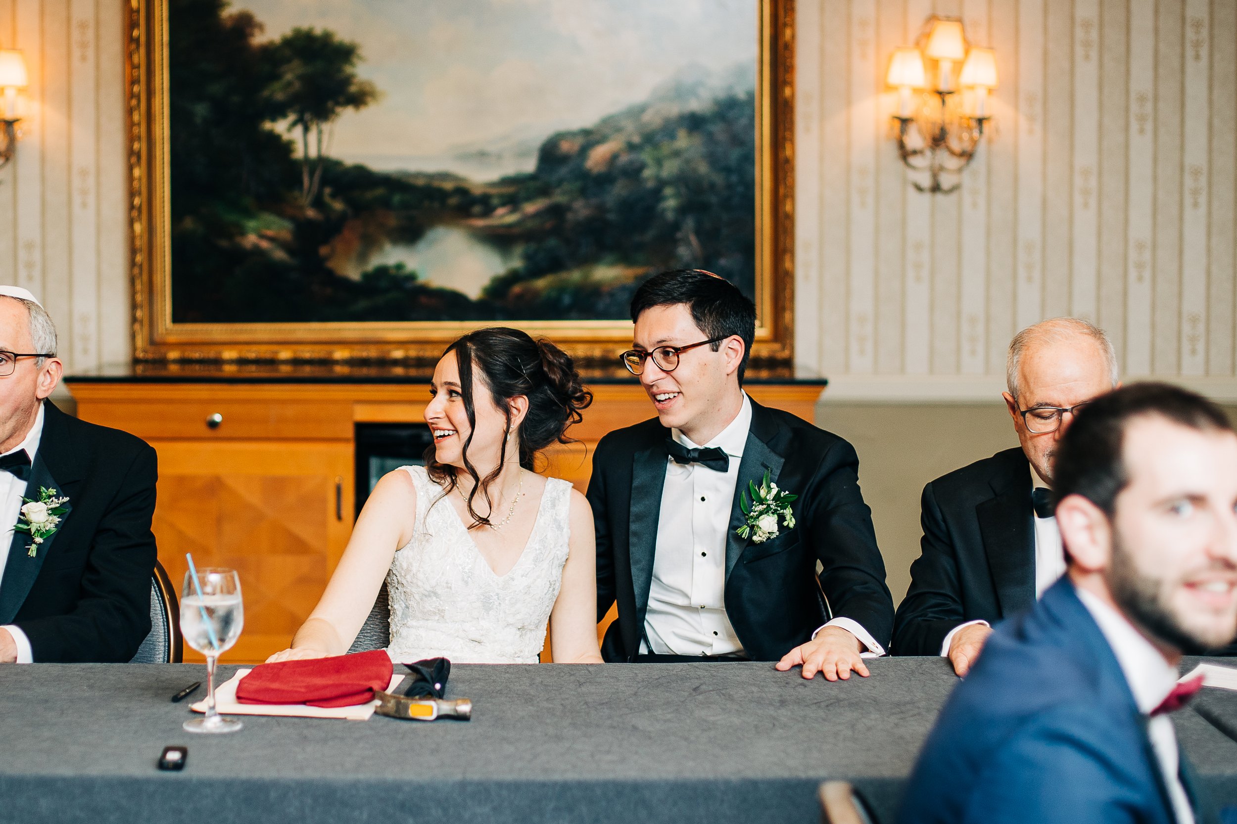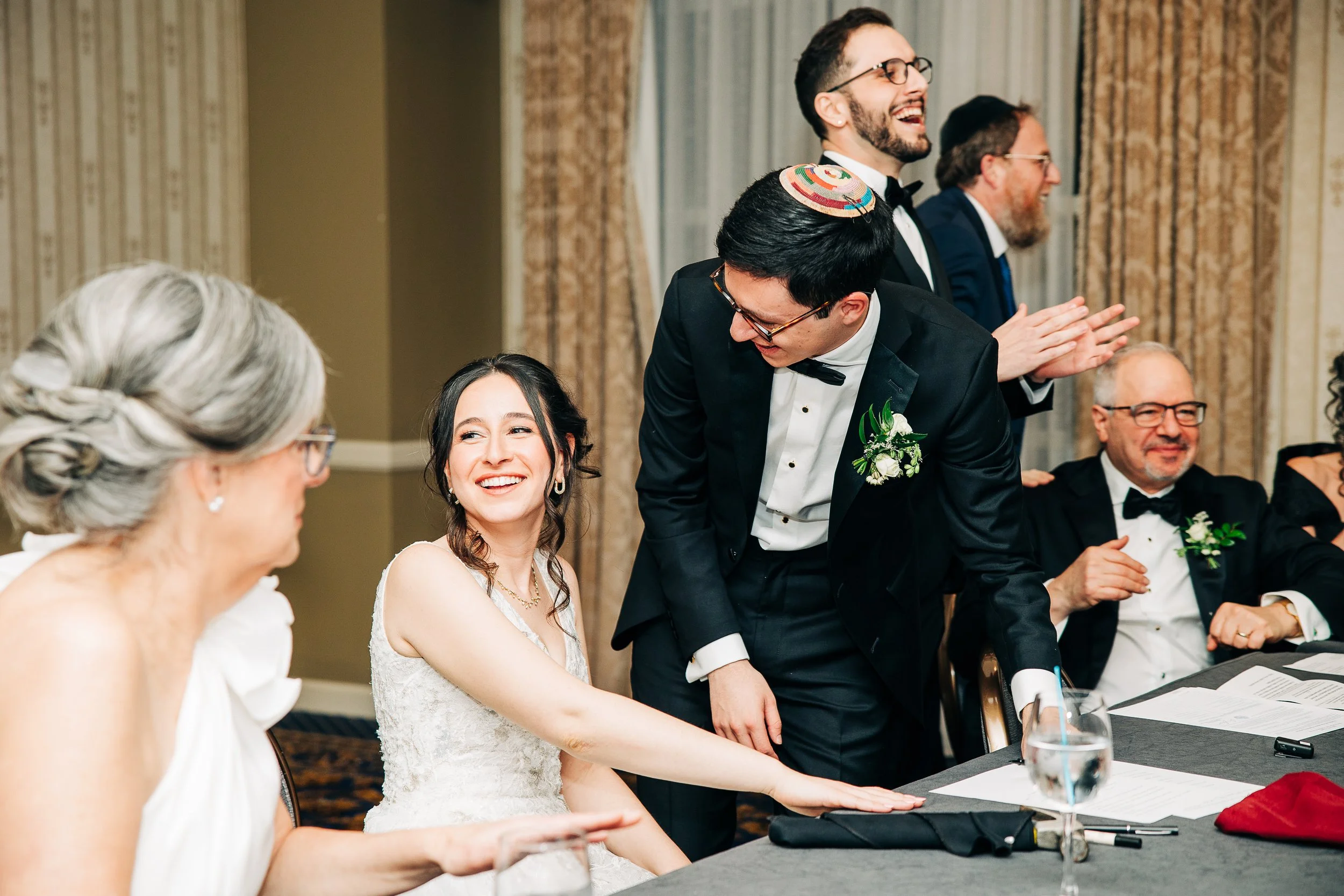Maddie and Jon also chose to highlight so many meaningful Jewish traditions throughout their day.. In addition to signing the ketubah during their marriage ceremony, they gathered a close group of loved ones before the ceremony itself to sign their marriage documents while everyone sang together. It was one of the most joyful and personal moments of the day, and it set the tone beautifully. Instead of the usual cocktail hour after the ceremony, they opted for a smorgasbord before. It gave guests a chance to eat, mingle, and celebrate early, and it created an energy that carried naturally into the ceremony.