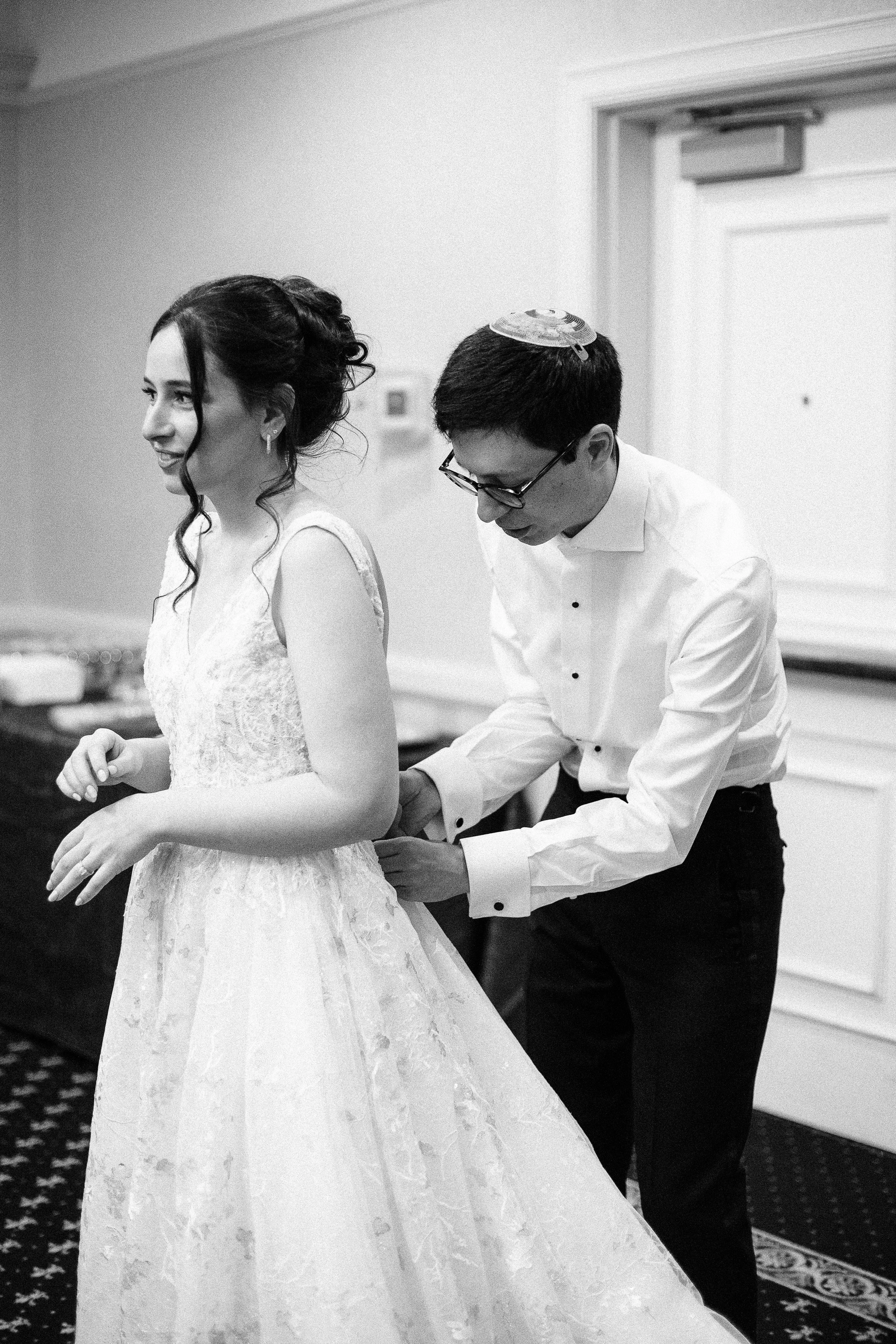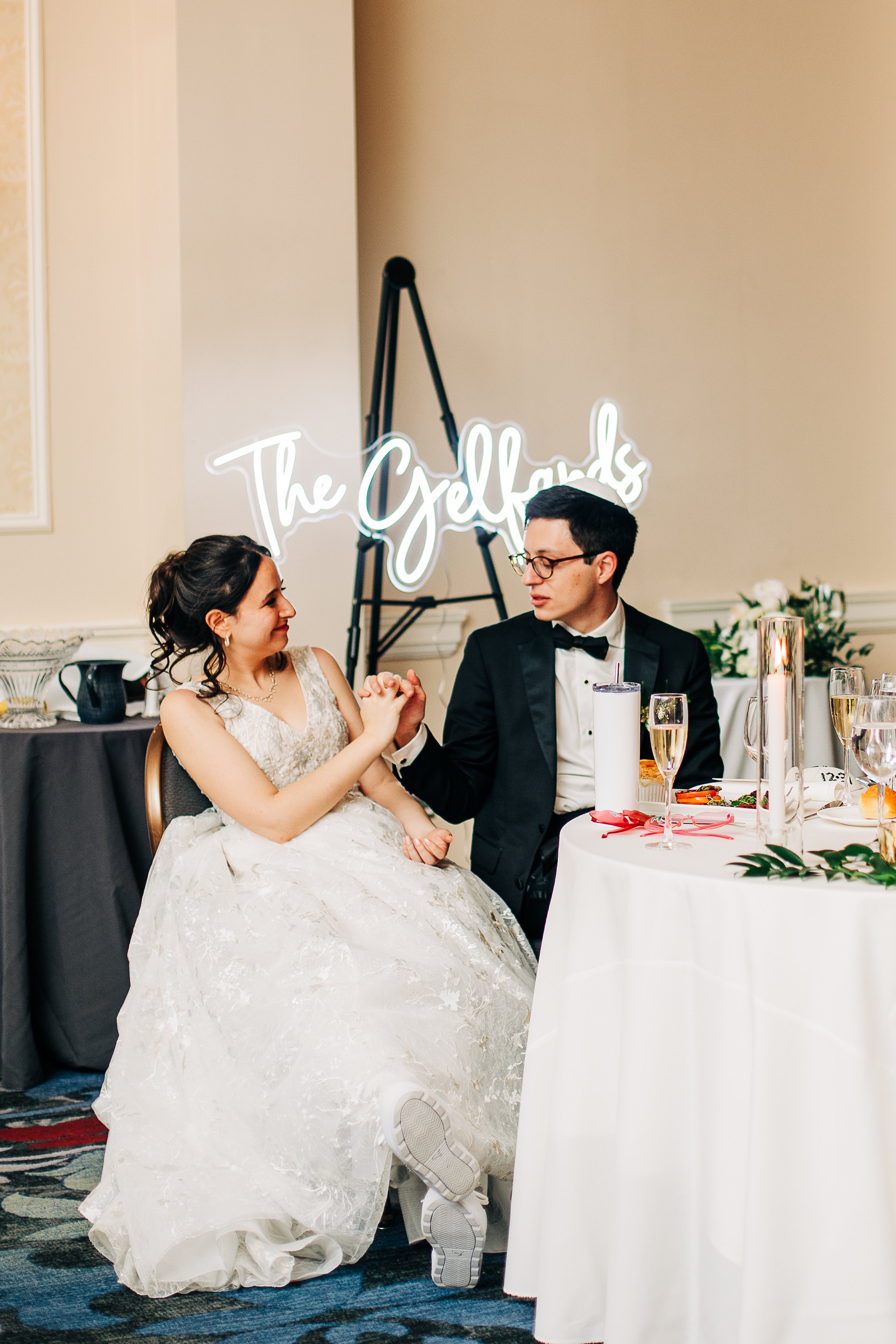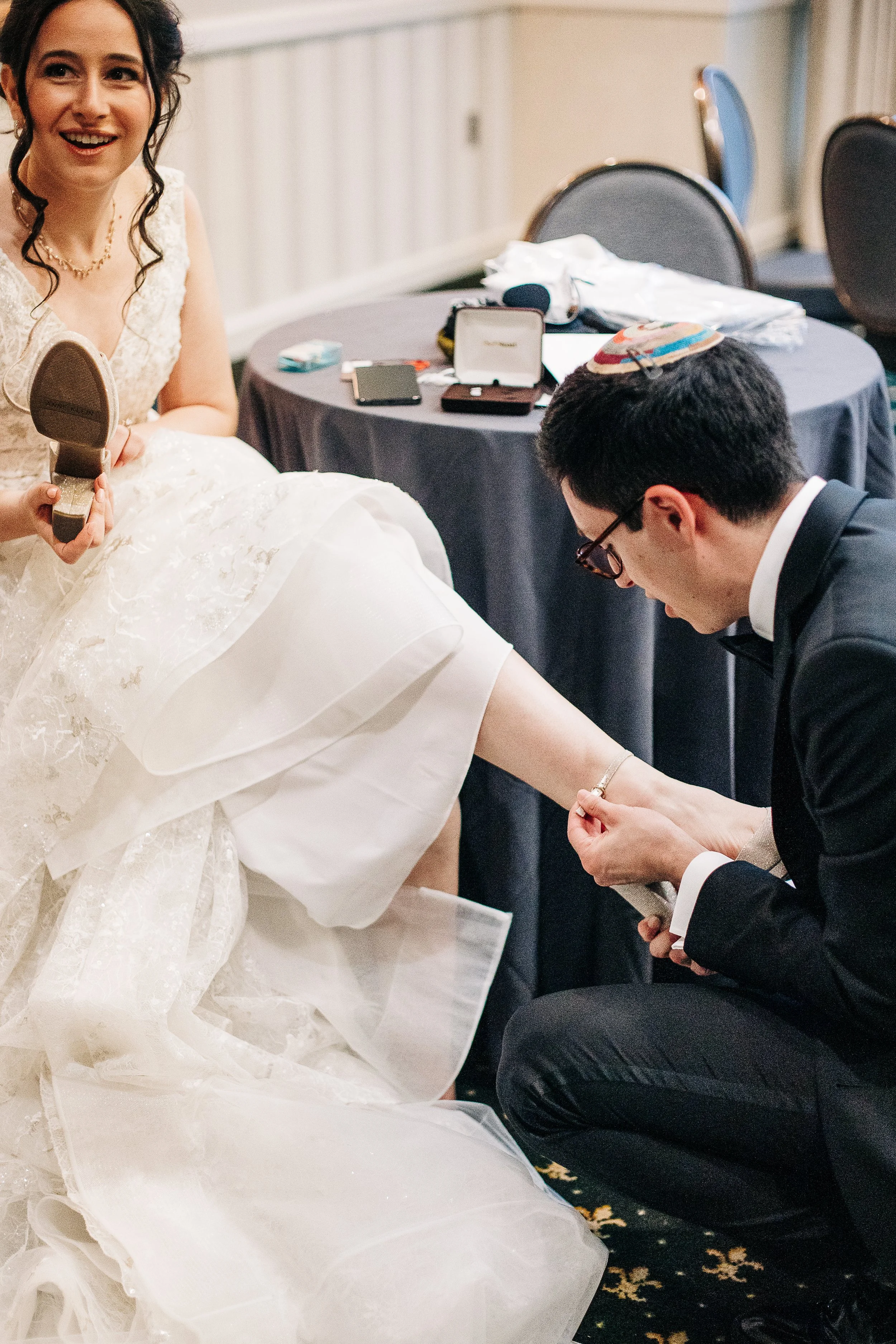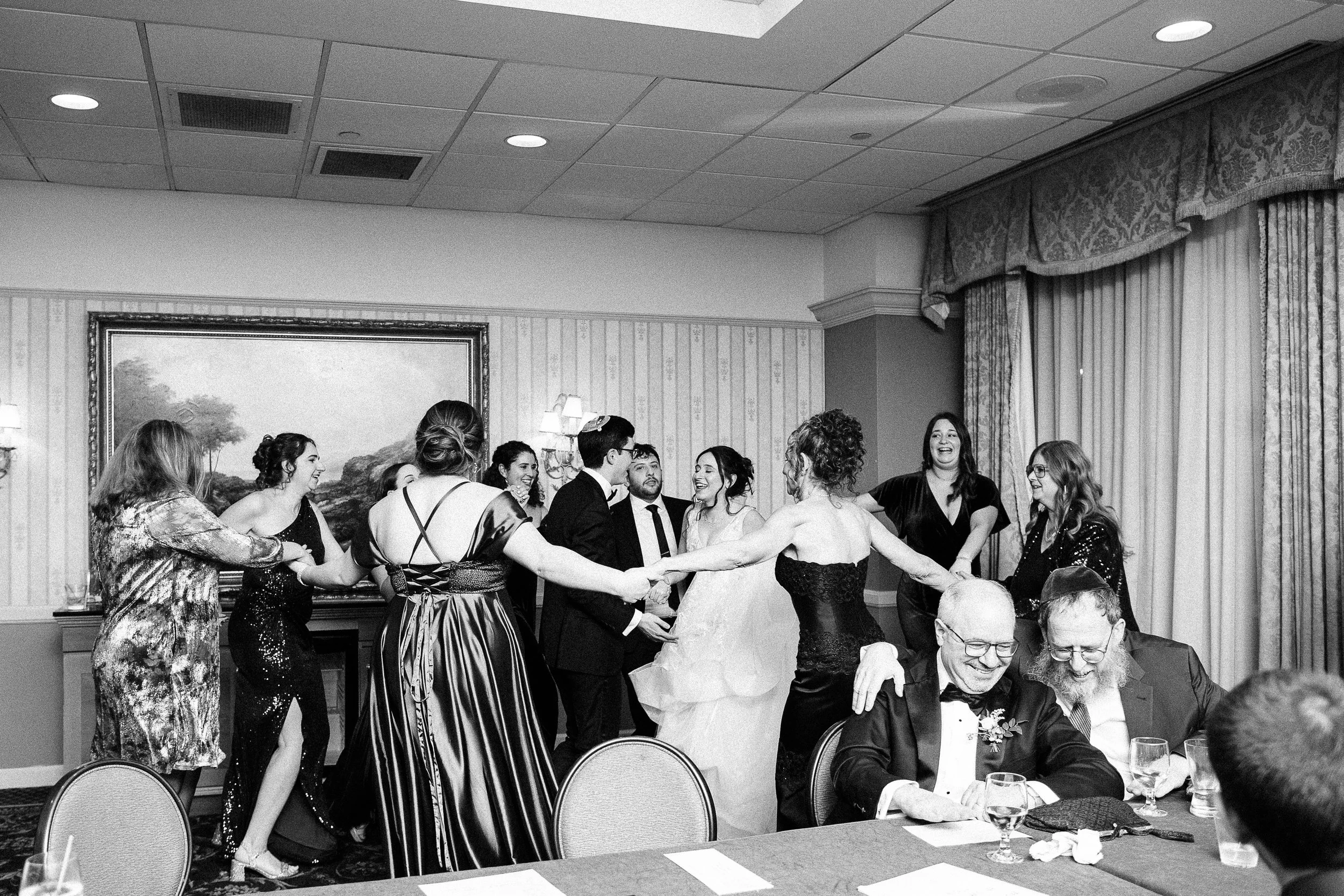 Maddie and Jon also chose to highlight so many meaningful Jewish traditions throughout their day.. In addition to signing the ketubah during their marriage ceremony, they gathered a close group of loved ones before the ceremony itself to sign their marriage documents while everyone sang together. It was one of the most joyful and personal moments of the day, and it set the tone beautifully. Instead of the usual cocktail hour after the ceremony, they opted for a smorgasbord before. It gave guests a chance to eat, mingle, and celebrate early, and it created an energy that carried naturally into the ceremony.