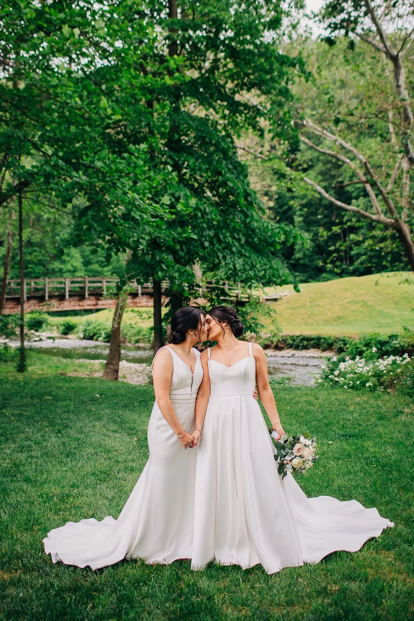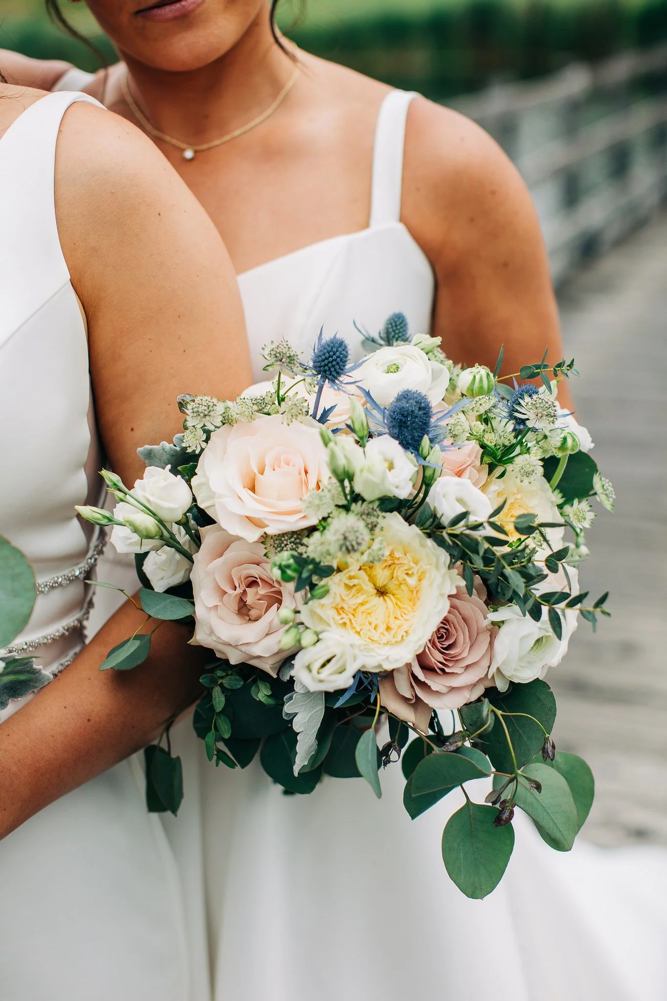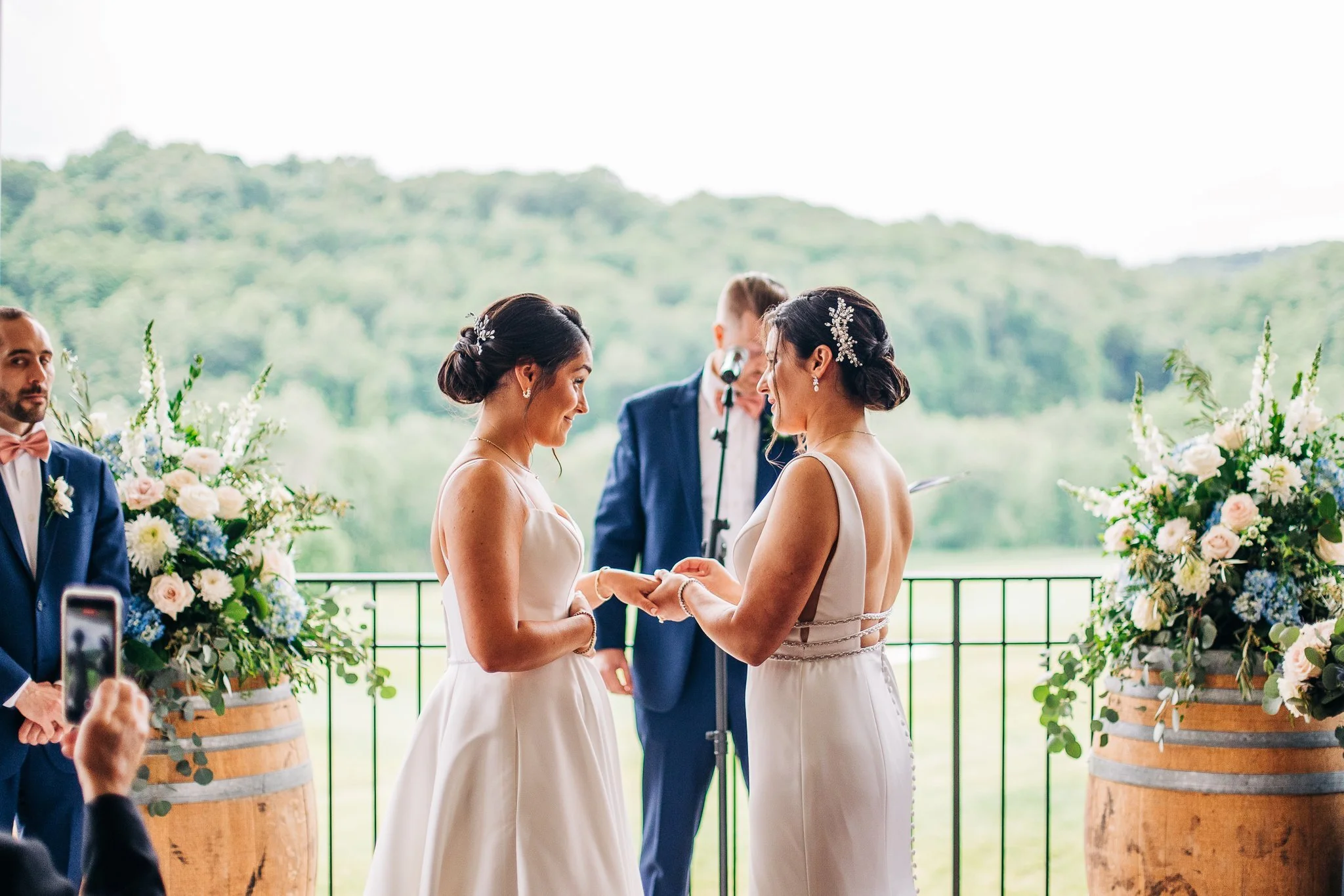 Kim and Angelica chose a fresh and light aesthetic for their wedding, decorating their ceremony and reception space with soft white, blue, and pink florals, and asking their wedding party to wear shades of both dark and dusty blue. Their wedding party was one of the most celebratory I’ve ever seen - they loved on these two amazing brides so well and so wholeheartedly.