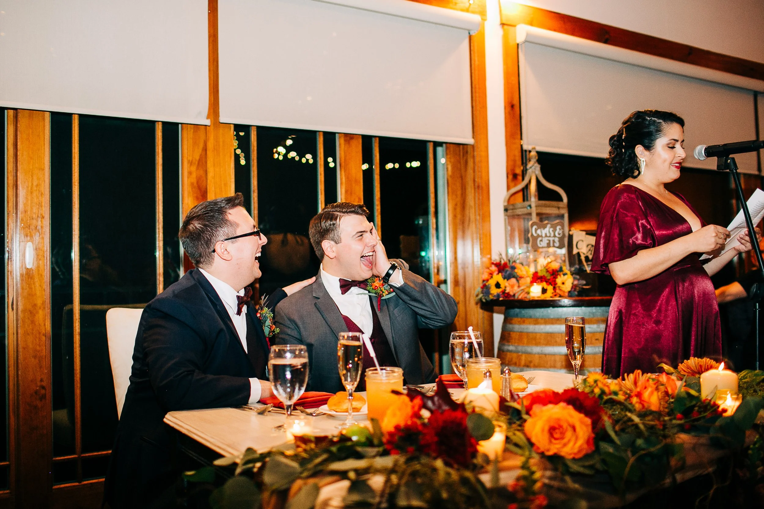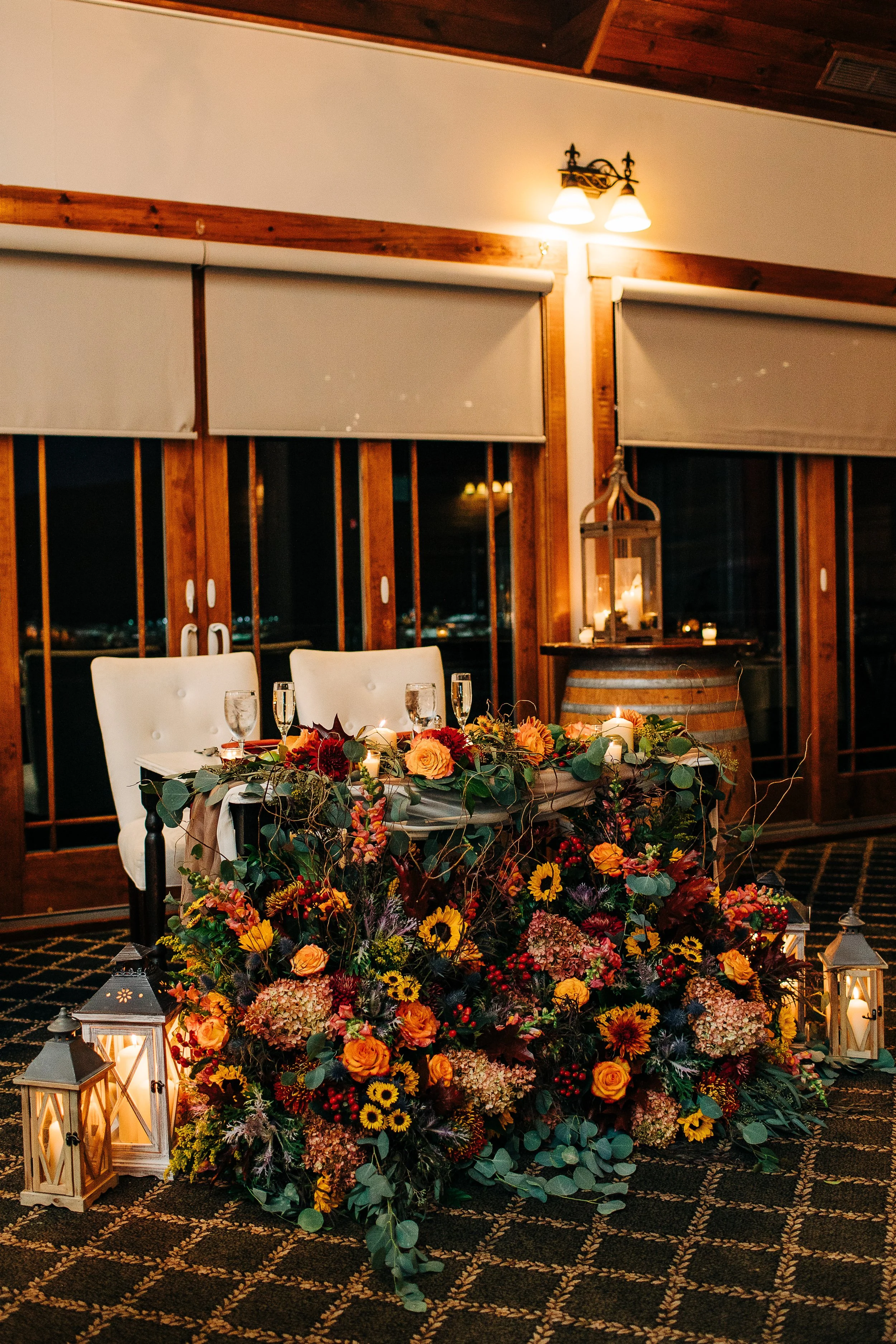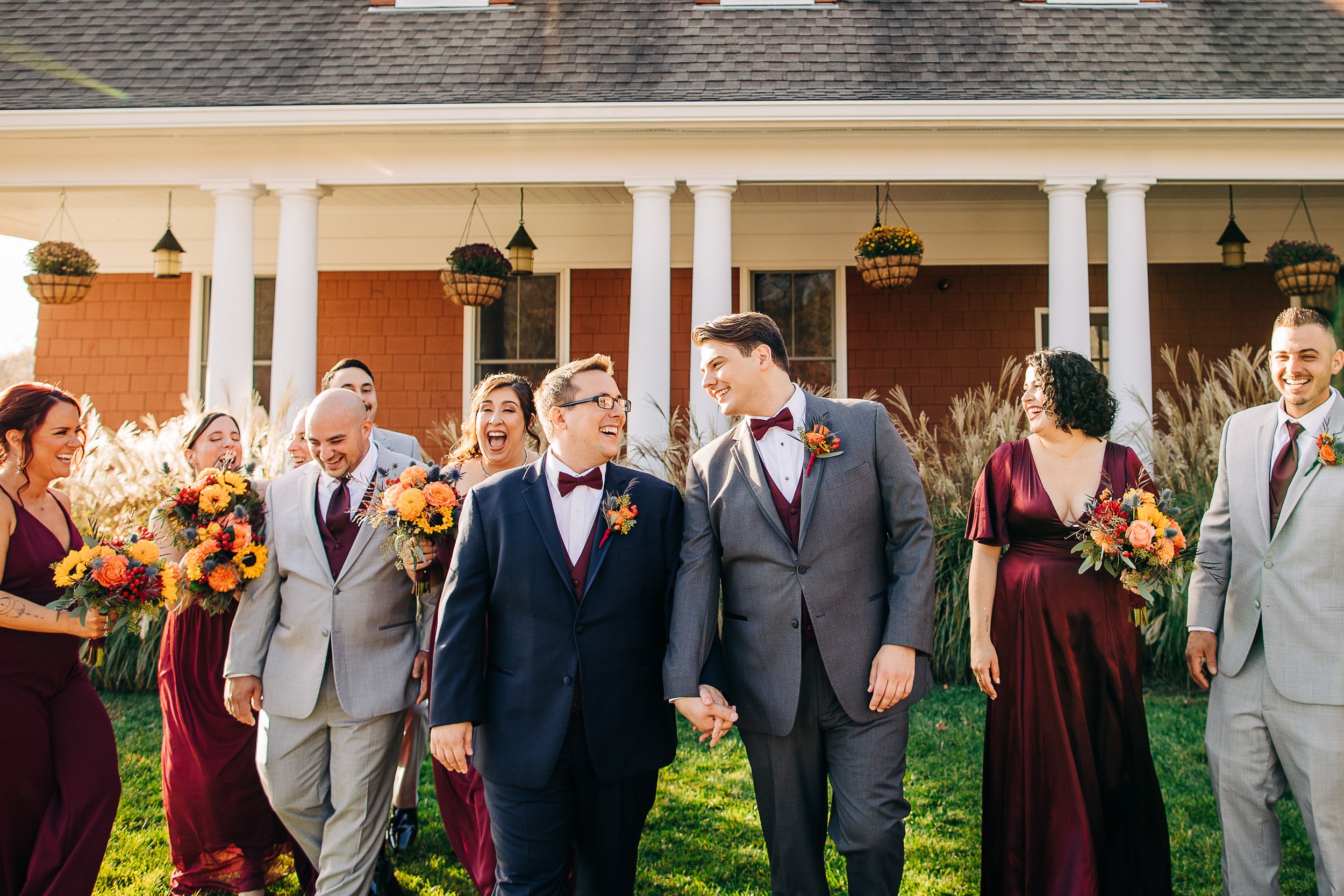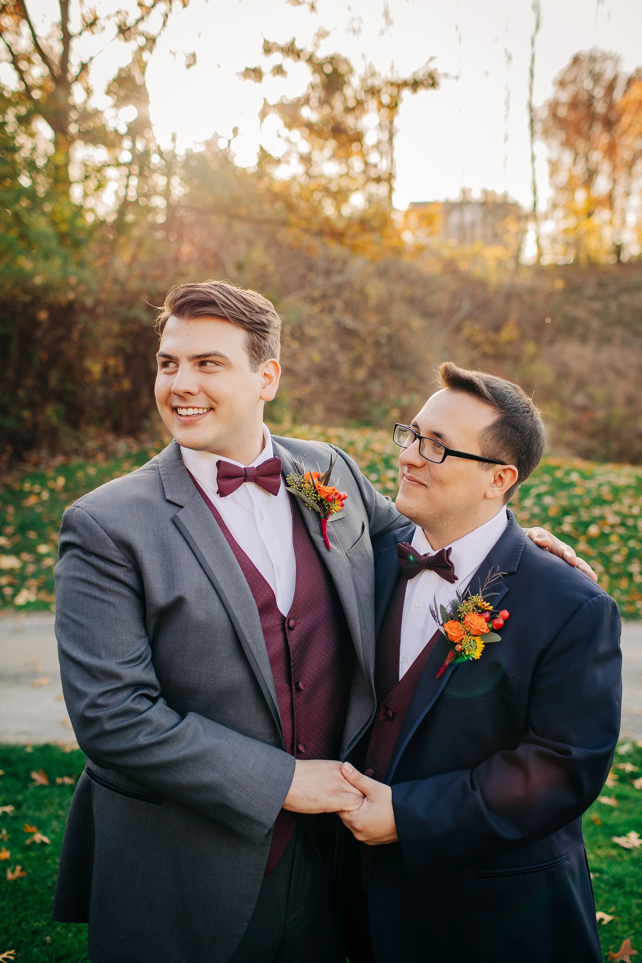 Because the fall season is so special to Teddy and Ryan, all of their details centered around autumnal hues, florals, and fruits. Their centerpieces were wooden lanterns surrounded by orange, red, and yellow flowers, with apples tucked into each arrangement. Their boutonnieres and ceremony flower arrangements mimicked their tablescapes, with orange roses and yellow blooms. Their wedding party wore wine and light gray, while Teddy wore a blue suit and Ryan wore a dark gray one. Everything was so perfectly stunning, and so beautifully autumnal.
