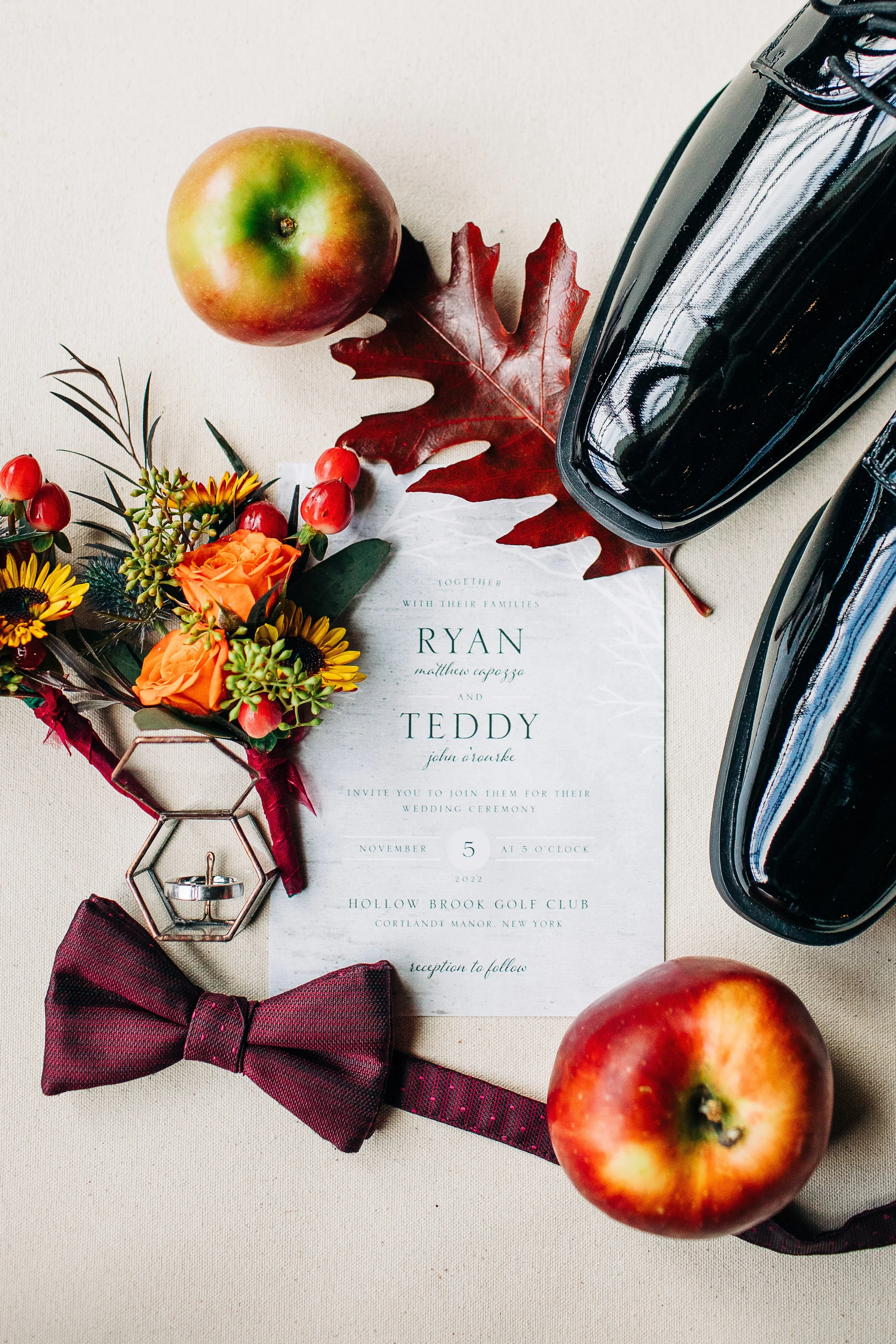 Teddy and Ryan got engaged at the apple orchard that Teddy has been visiting since he was young. They love the fall, so obviously both their engagement and wedding journeys involved the autumn season and all of its fun activities in the Hudson Valley.