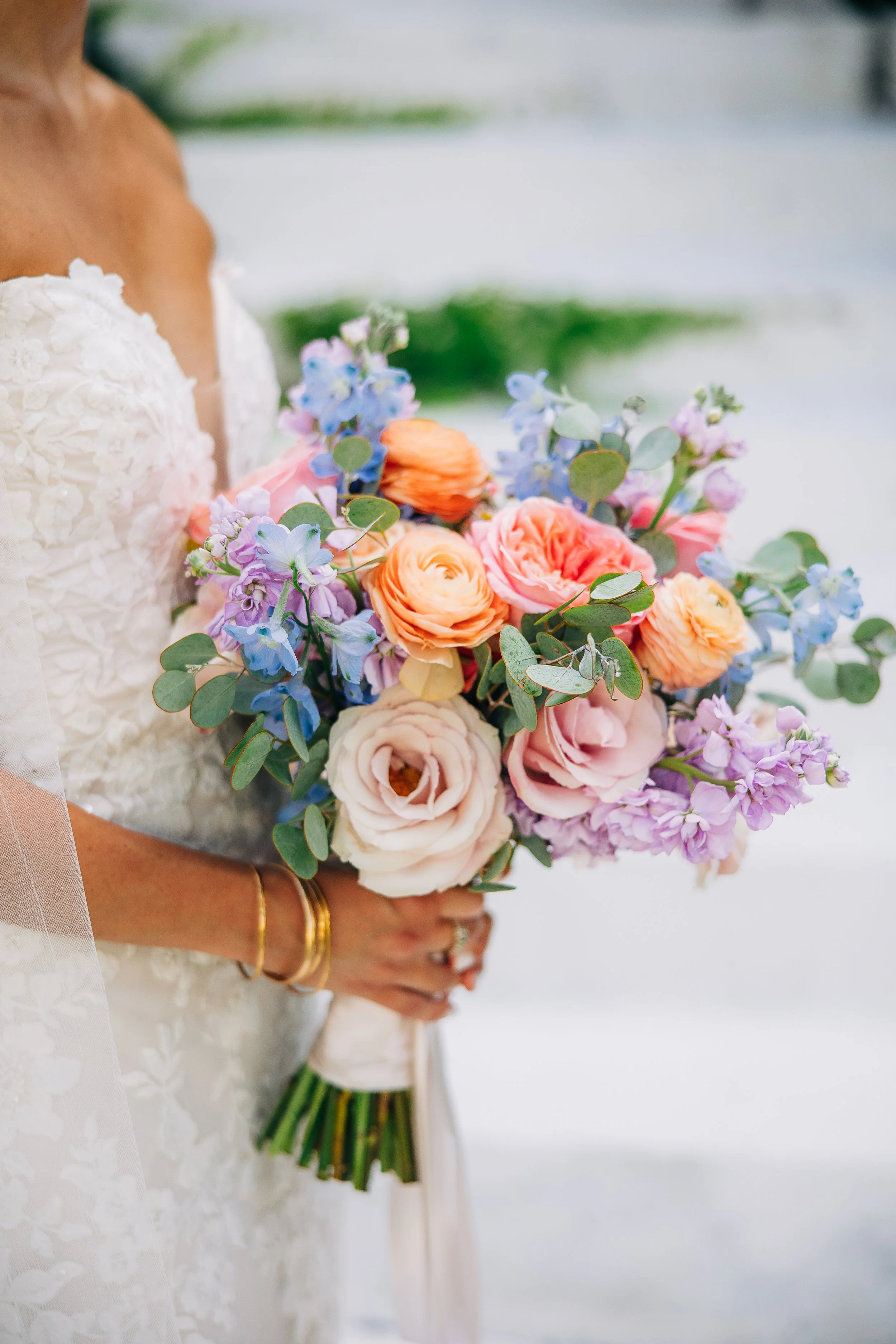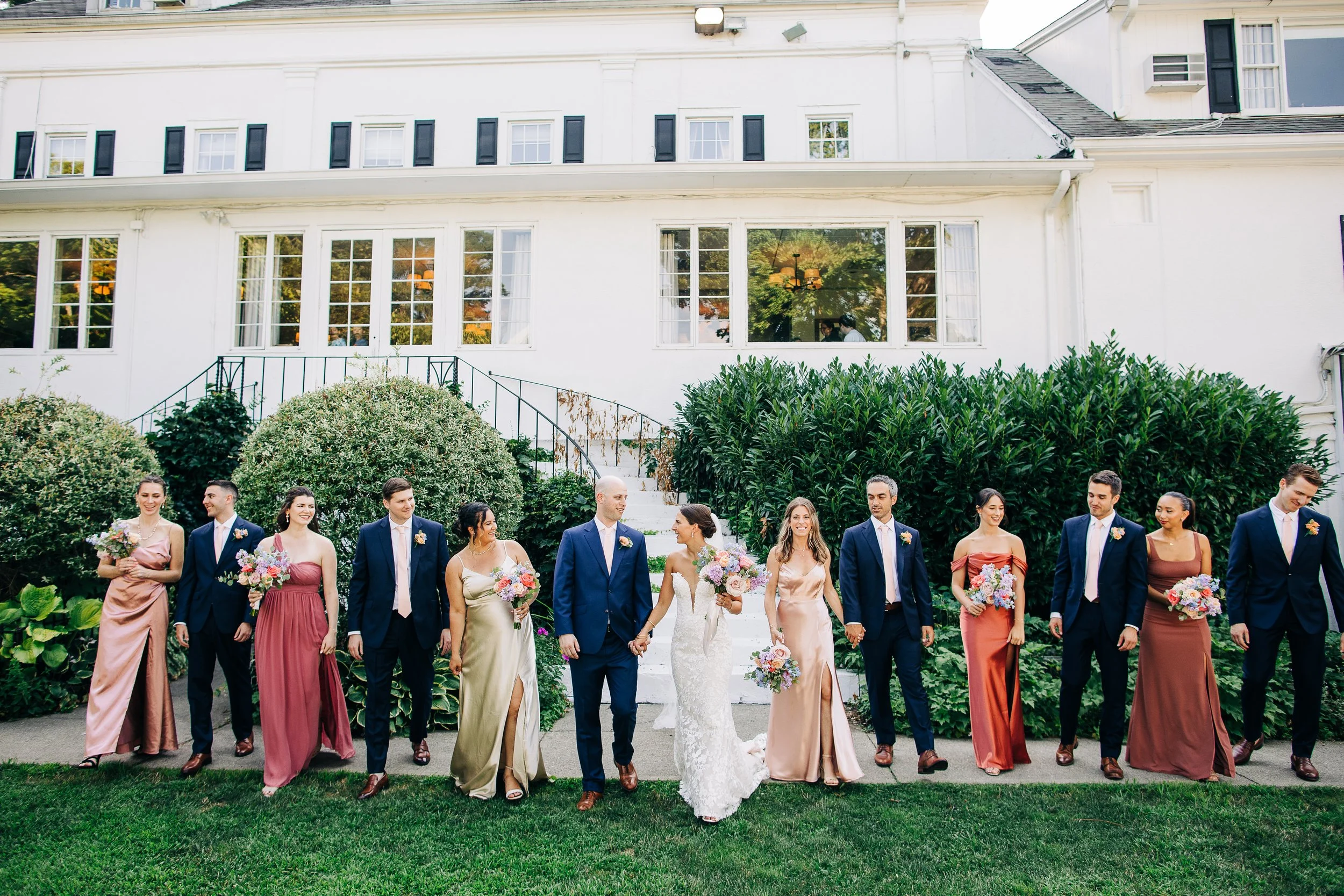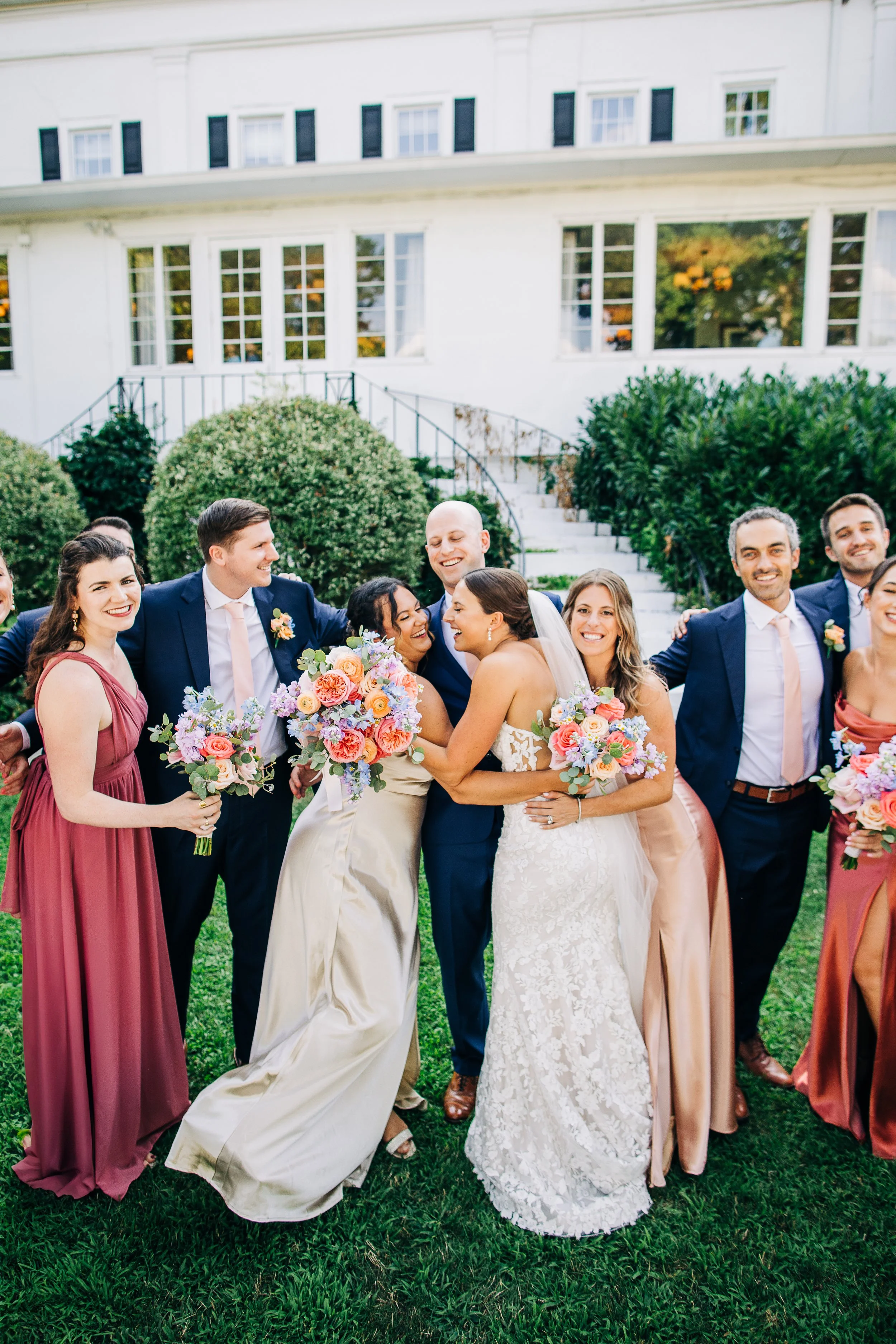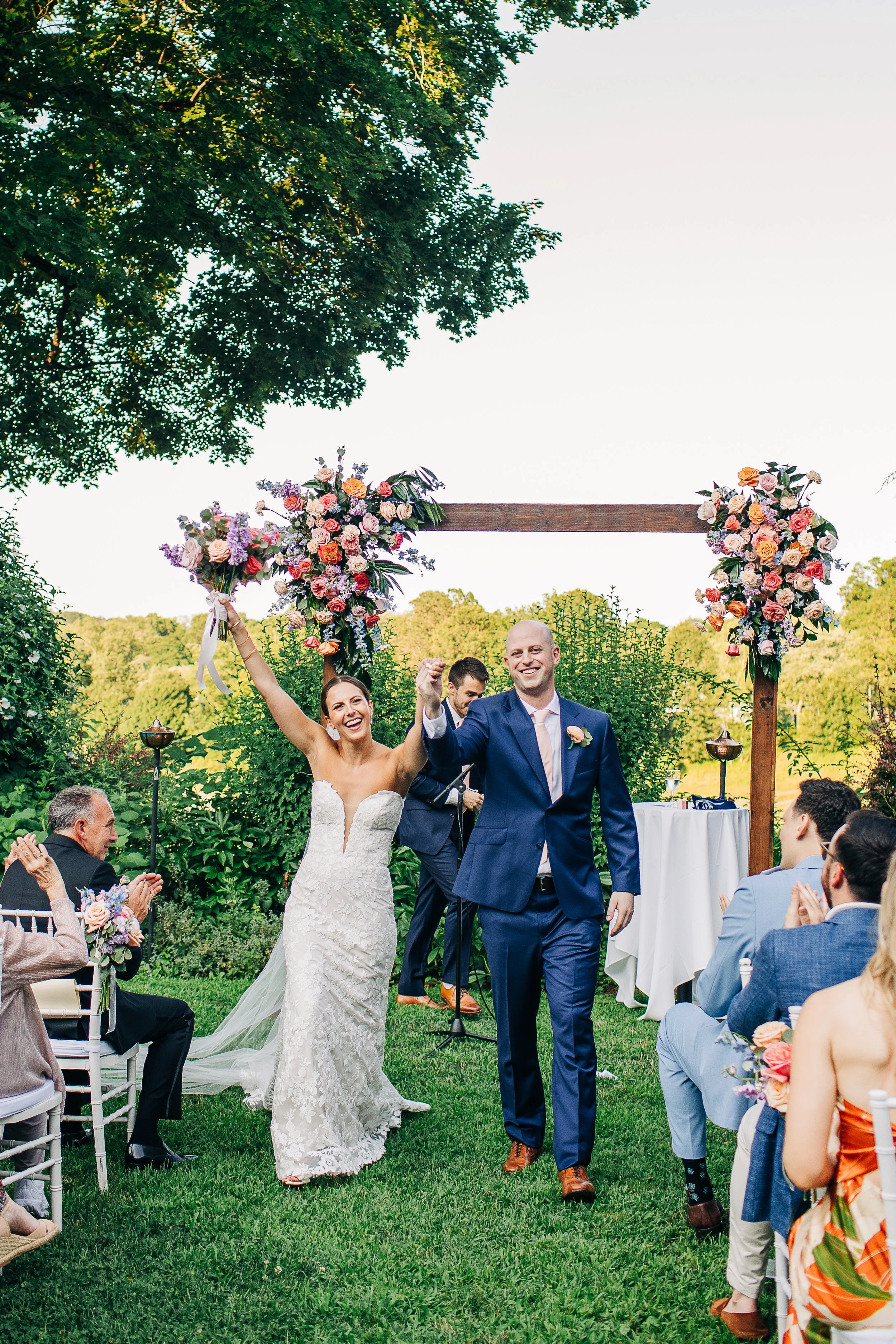 The wedding party wore blush, champagne, and navy - a combination that looked stunning against all the green outside. The florals were where things really came alive. Instead of going the soft and neutral route, Dani and Dan went with bold, colorful arrangements that felt celebratory and exciting. It all came together beautifully and photographed perfectly.