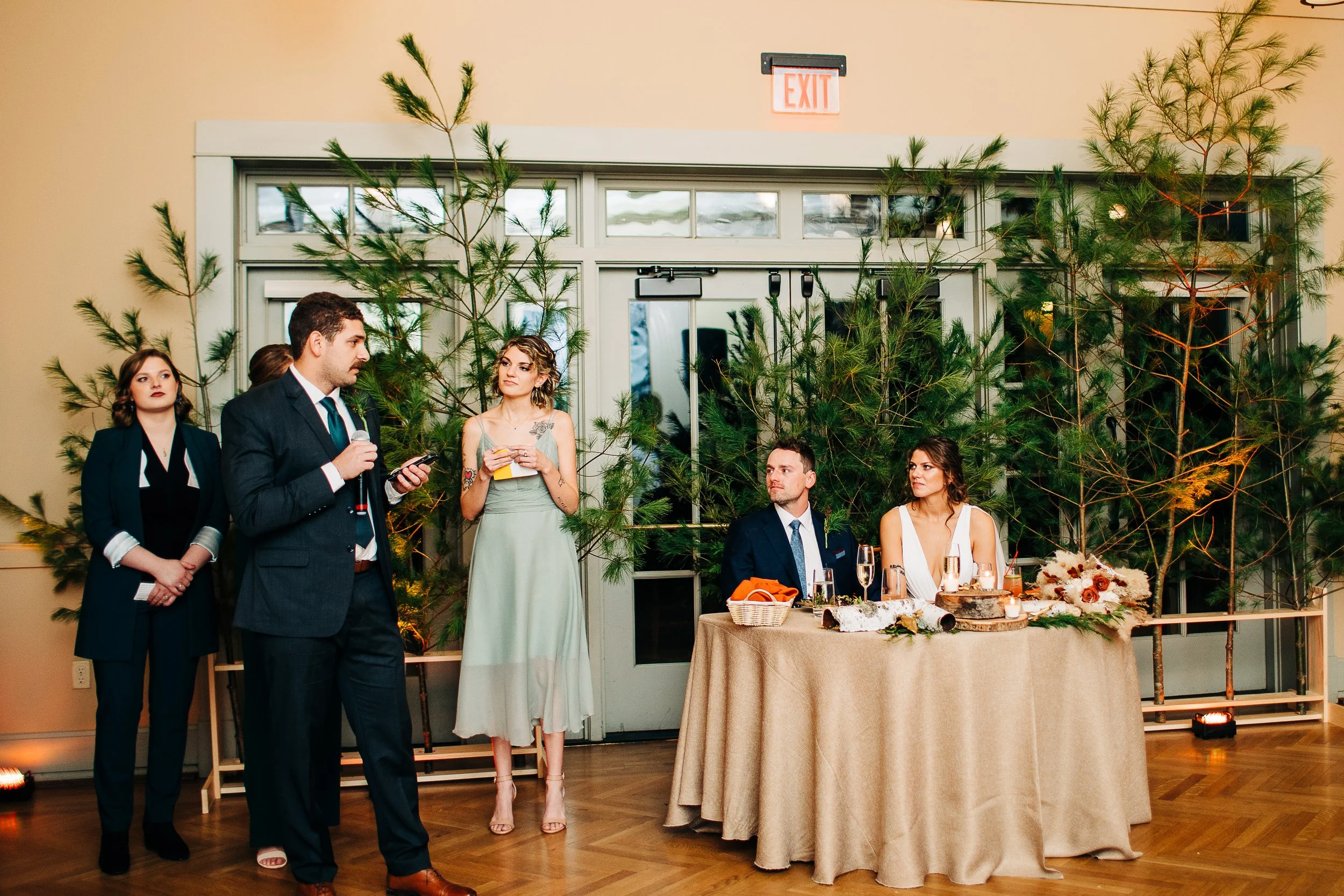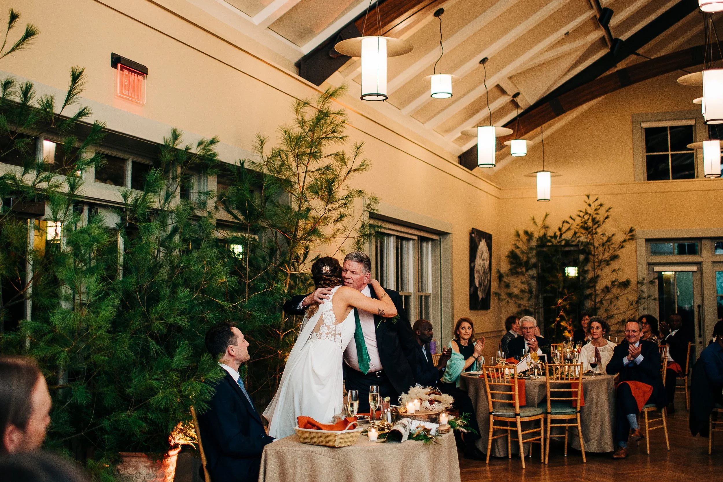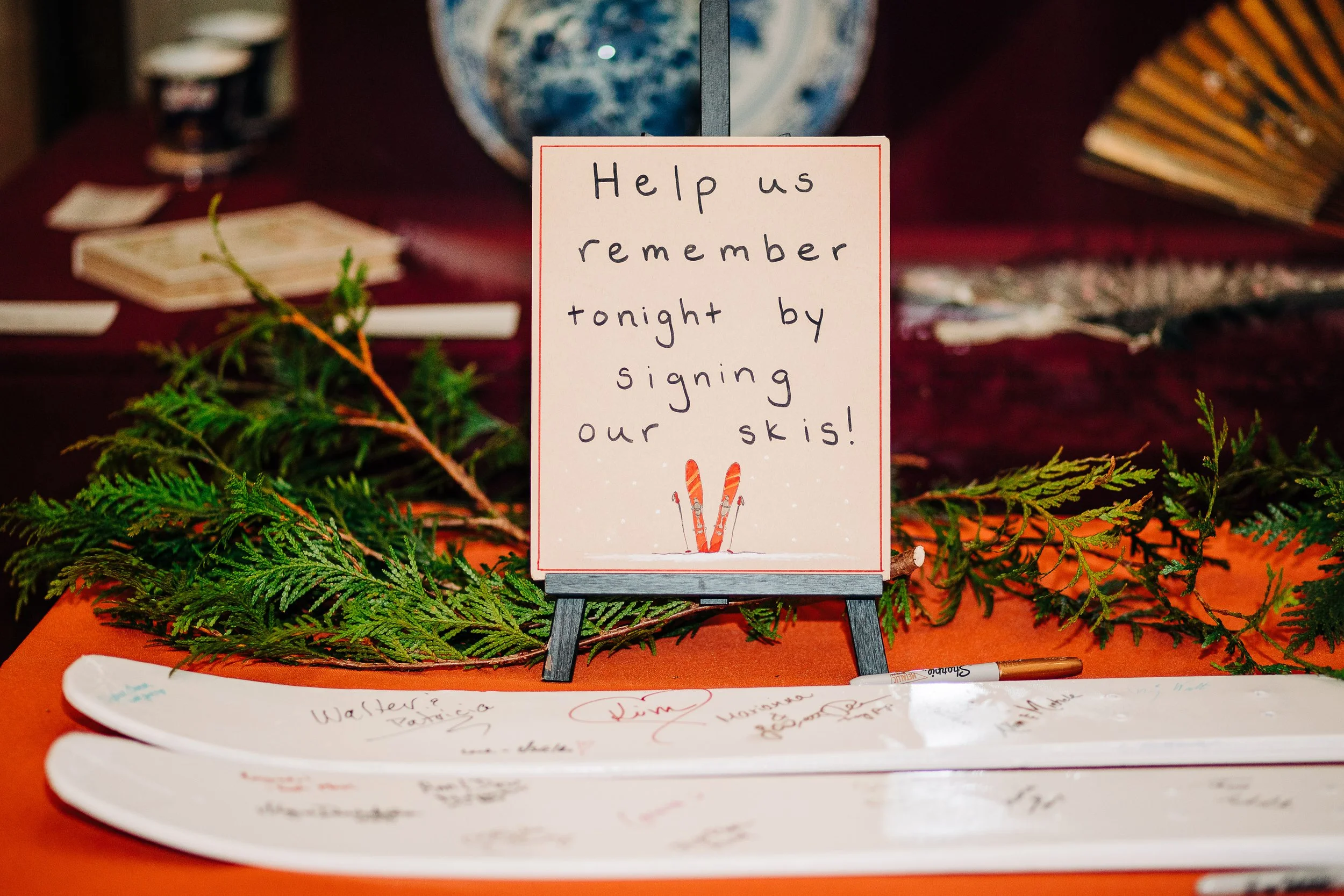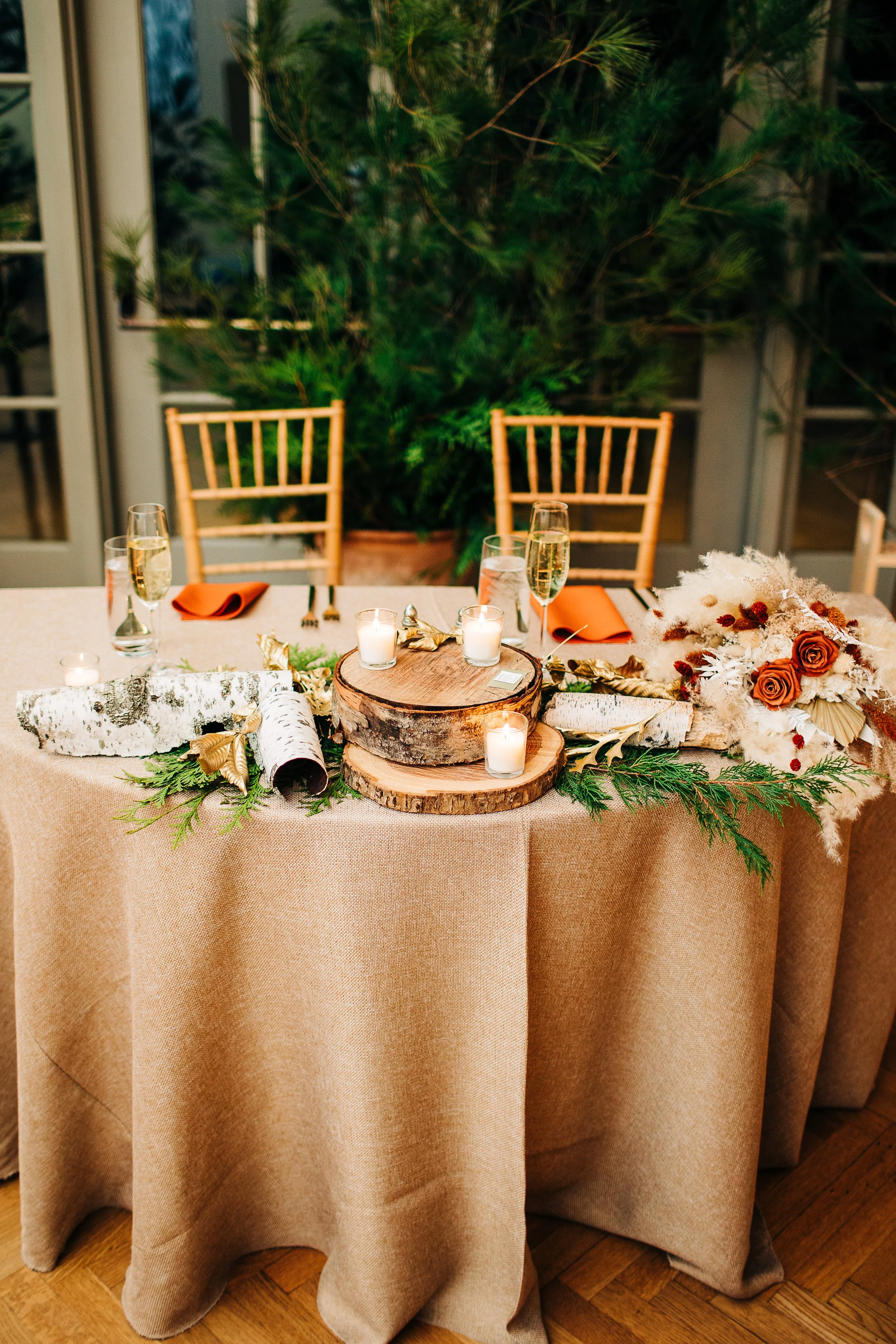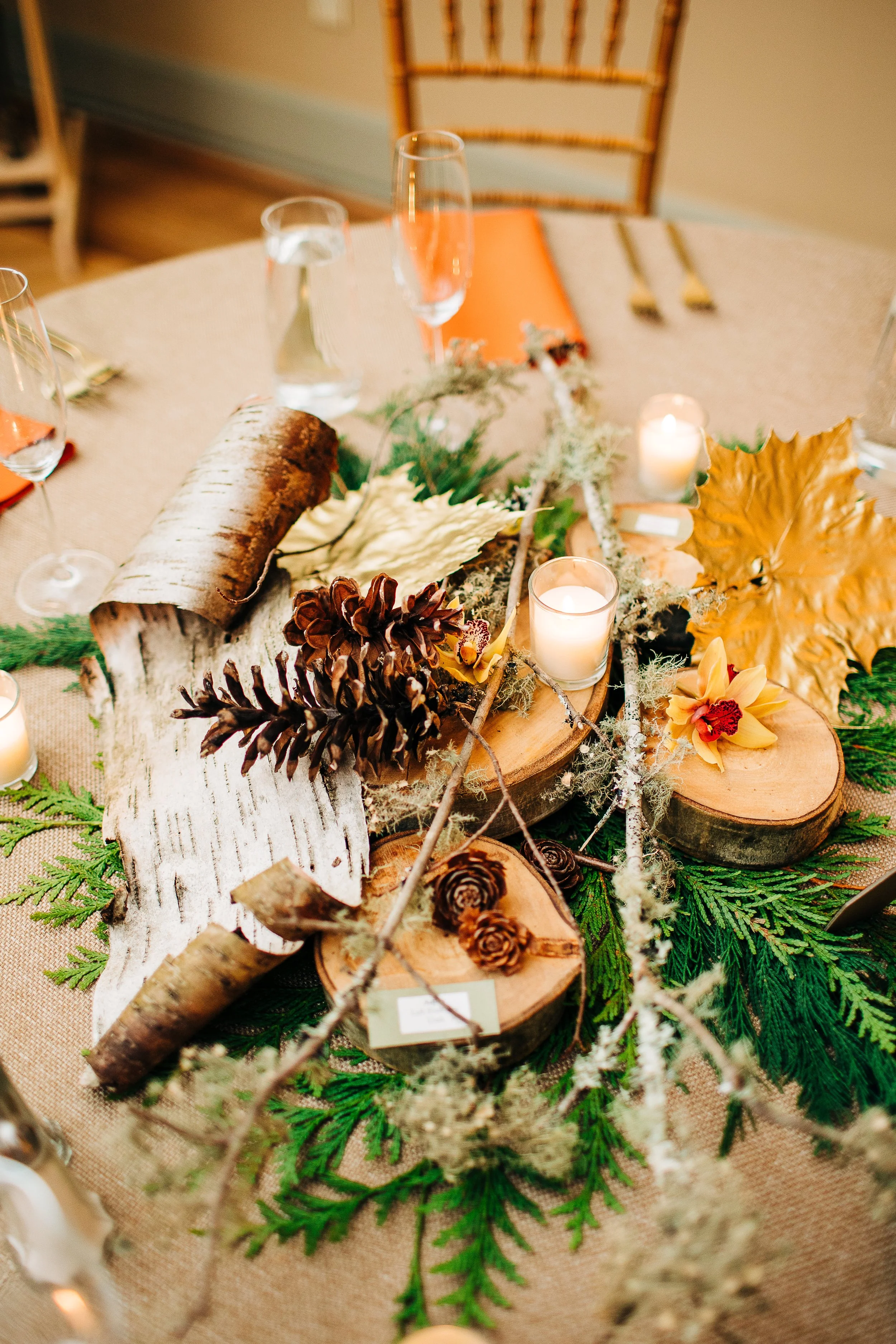 Mary and Tom’s reception decor was some of my most favorite ever. Because of their deep love for adventure and the outdoors, their tablescapes were filled with natural and DIY elements, in addition to the trees (whole trees!) they used for both their ceremony and reception. Of course, they had other elements that were important to them (like their wooden rings and signed skis), but their indoor decor really was the highlight.