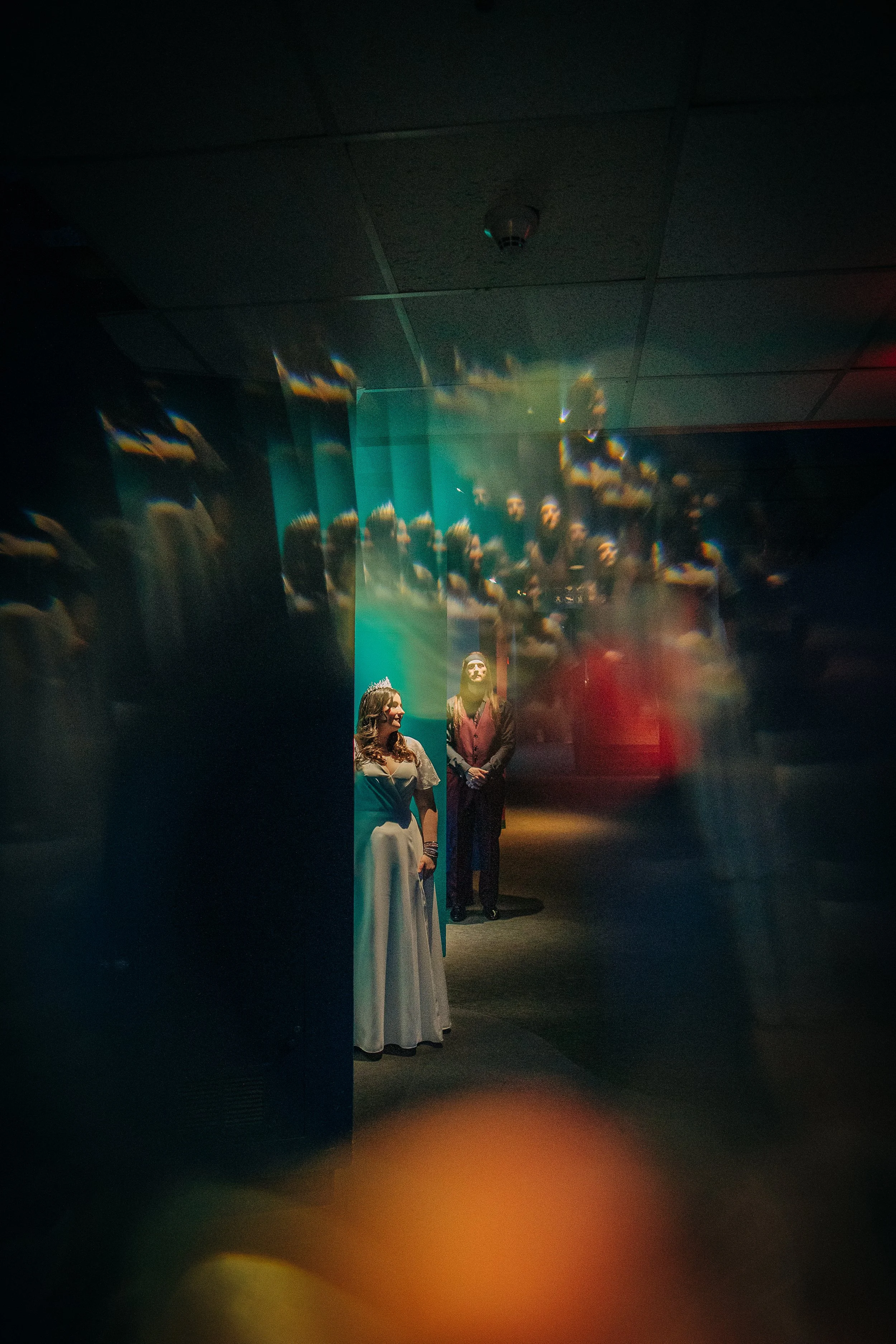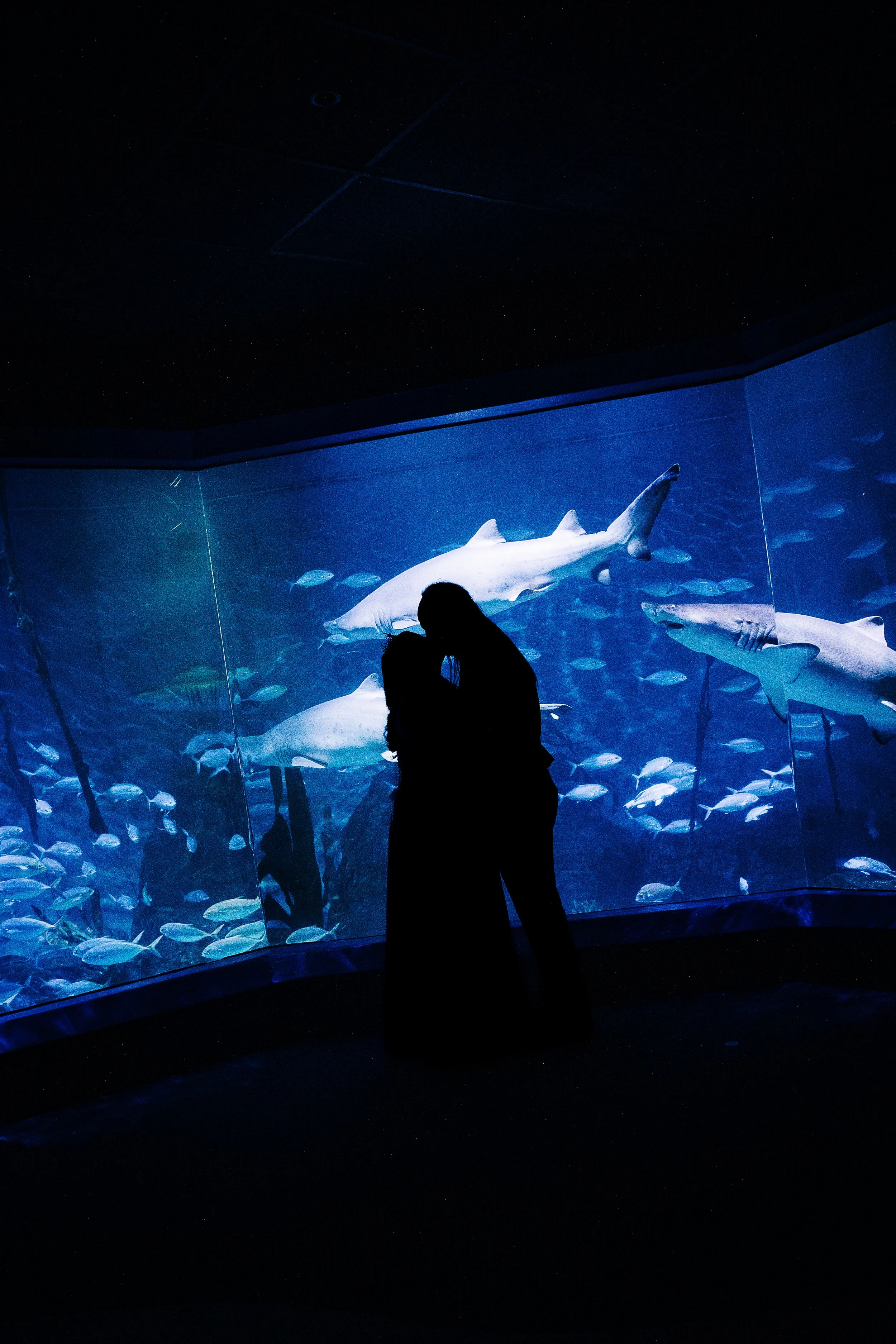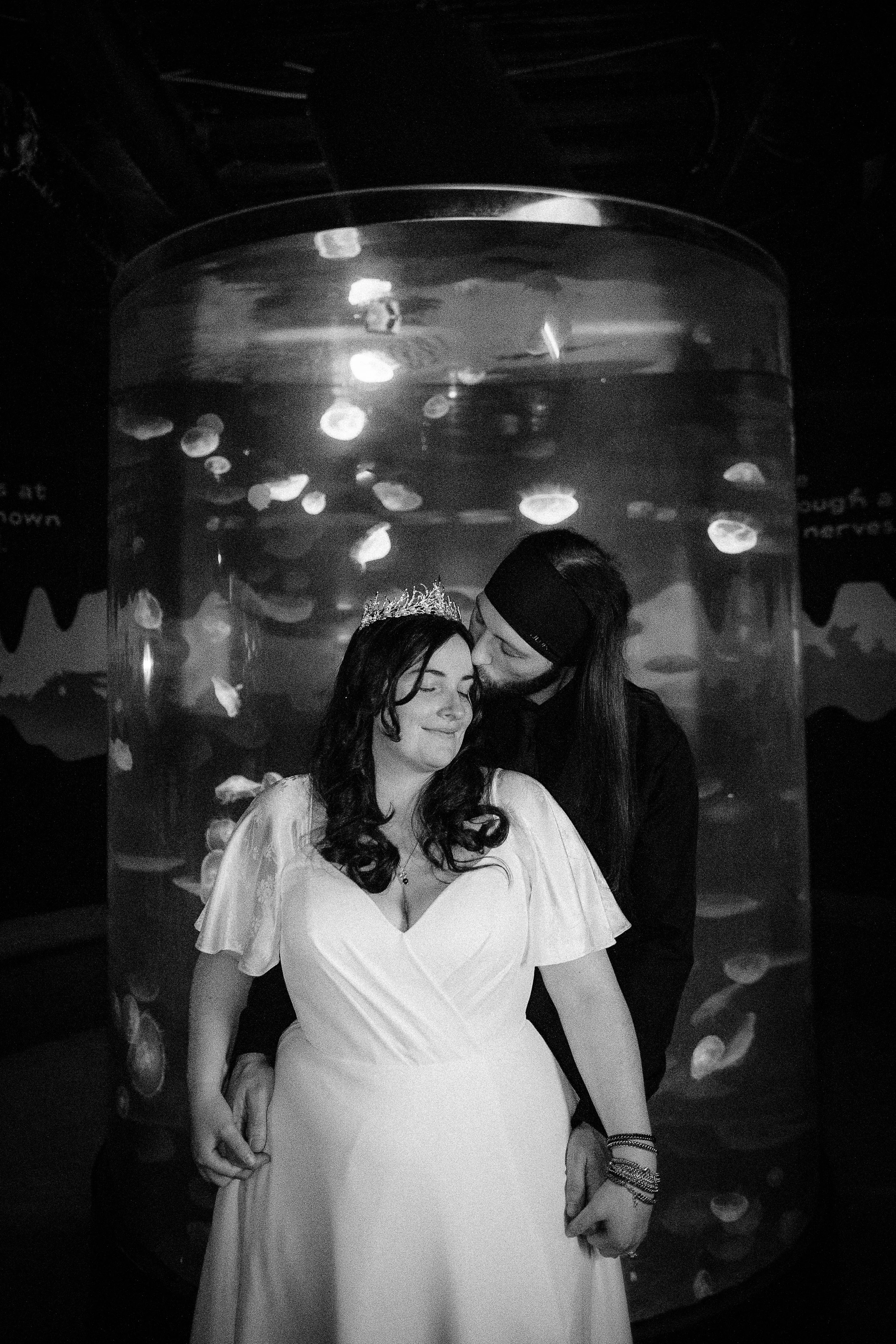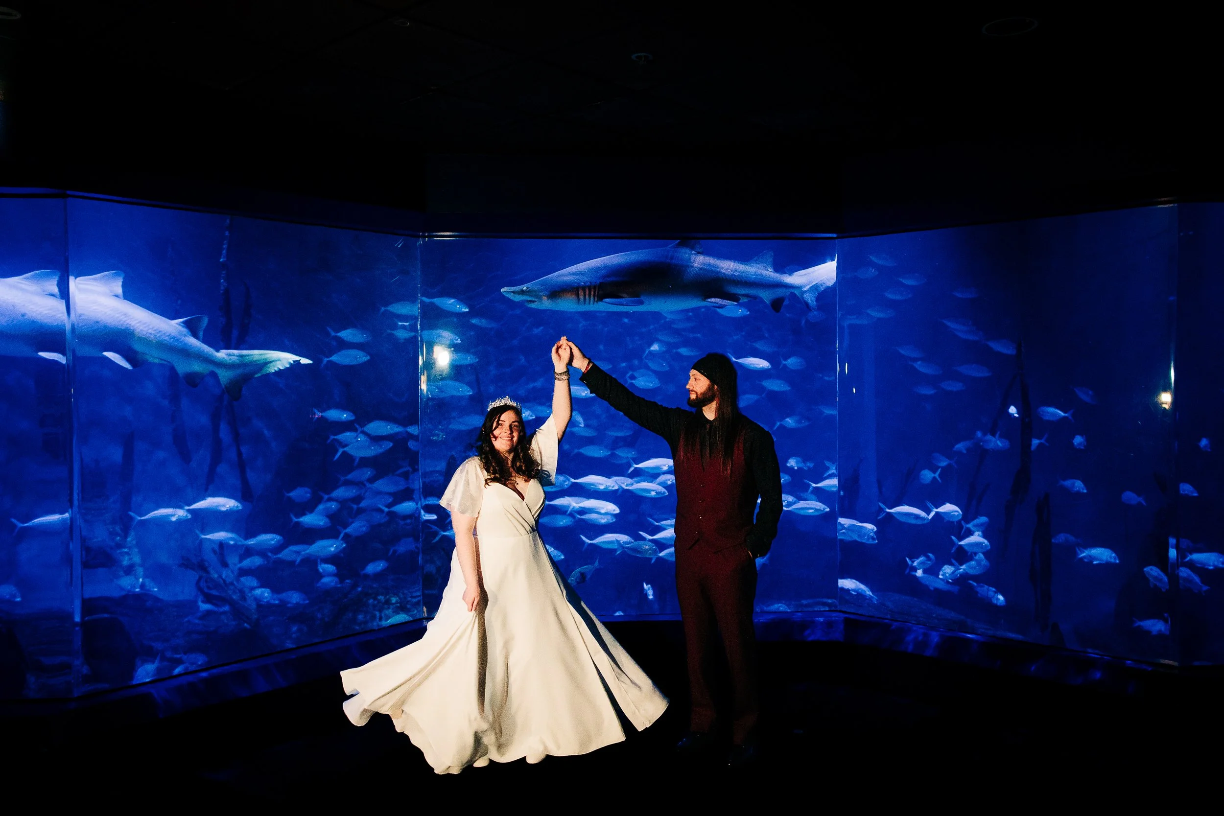 The shark room offered another gift entirely. We took silhouette shots there, the couple's forms dark against the illuminated tank while sharks glided behind them. The couple became shadows, and the sharks became the stars. It was moody, dramatic, and entirely fitting for a wedding that didn’t follow a traditional script.