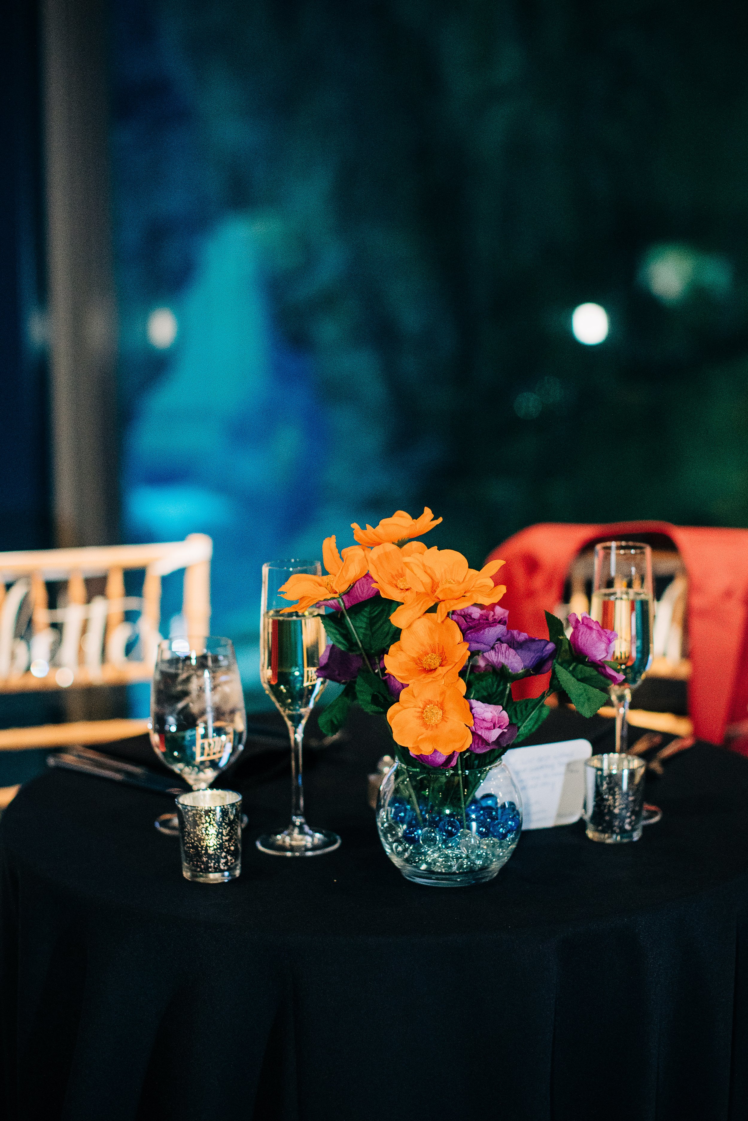 The wedding party wore black and burgundy, sophisticated shades that photographed gorgeously. But the real color explosion came at the reception tables, each one dressed with bright, bold florals in a different hue. It was unexpected and joyful.