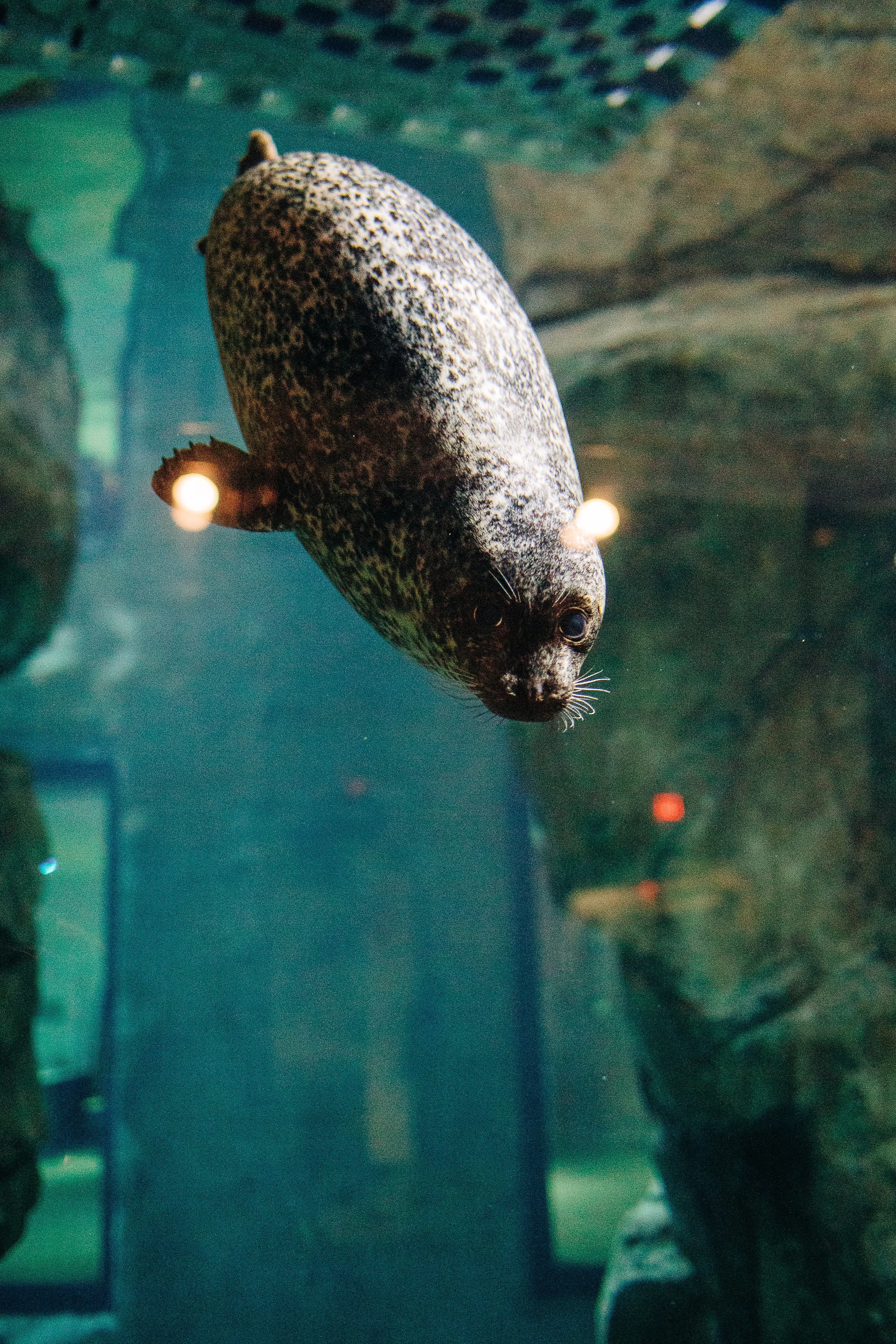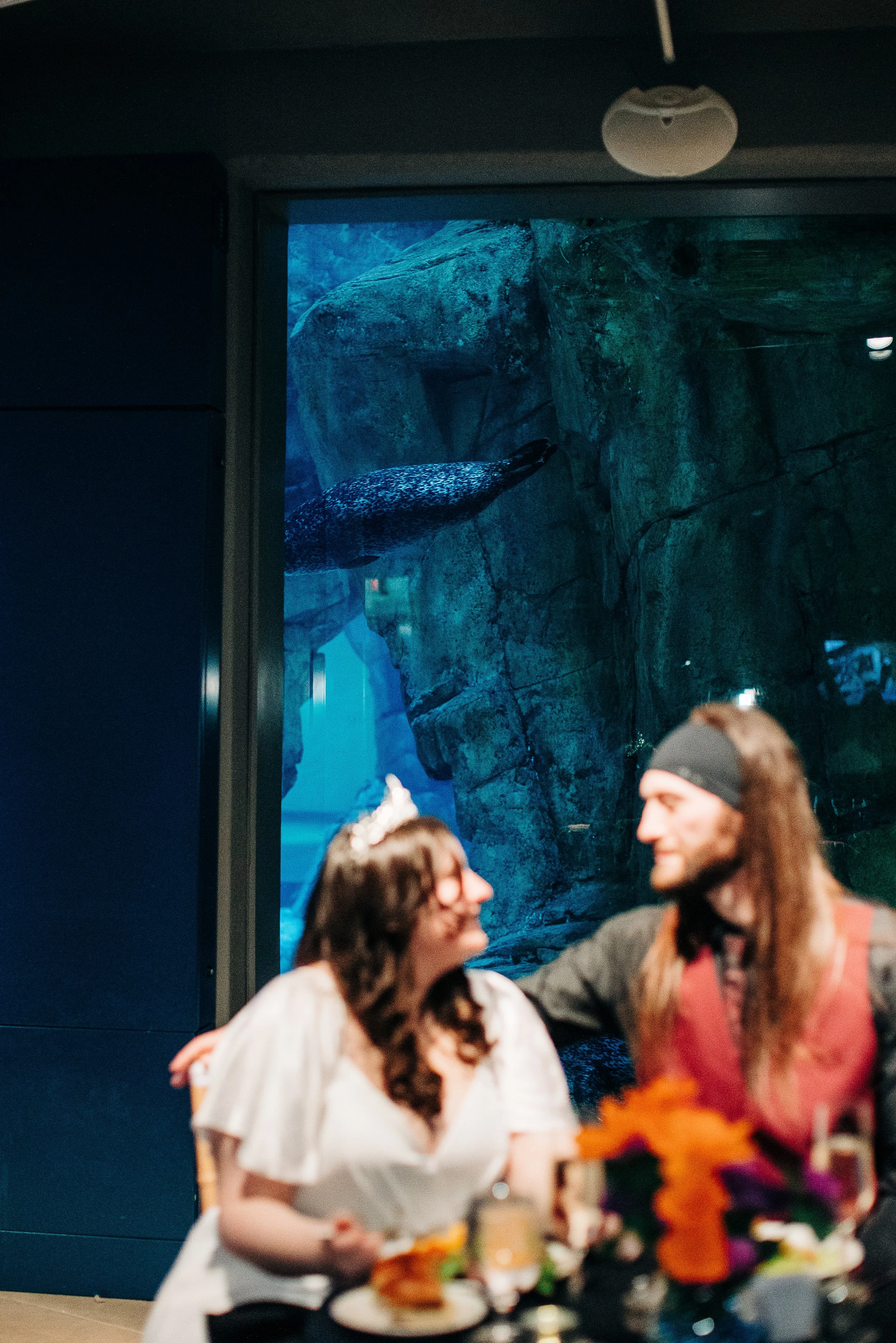 The reception unfolded in the aquarium's event space, seals swimming in tanks behind the couple as they enjoyed their dinner. The contrast between the wedding party's dark, moody palette and the tables' vibrant florals created layers of visual interest.