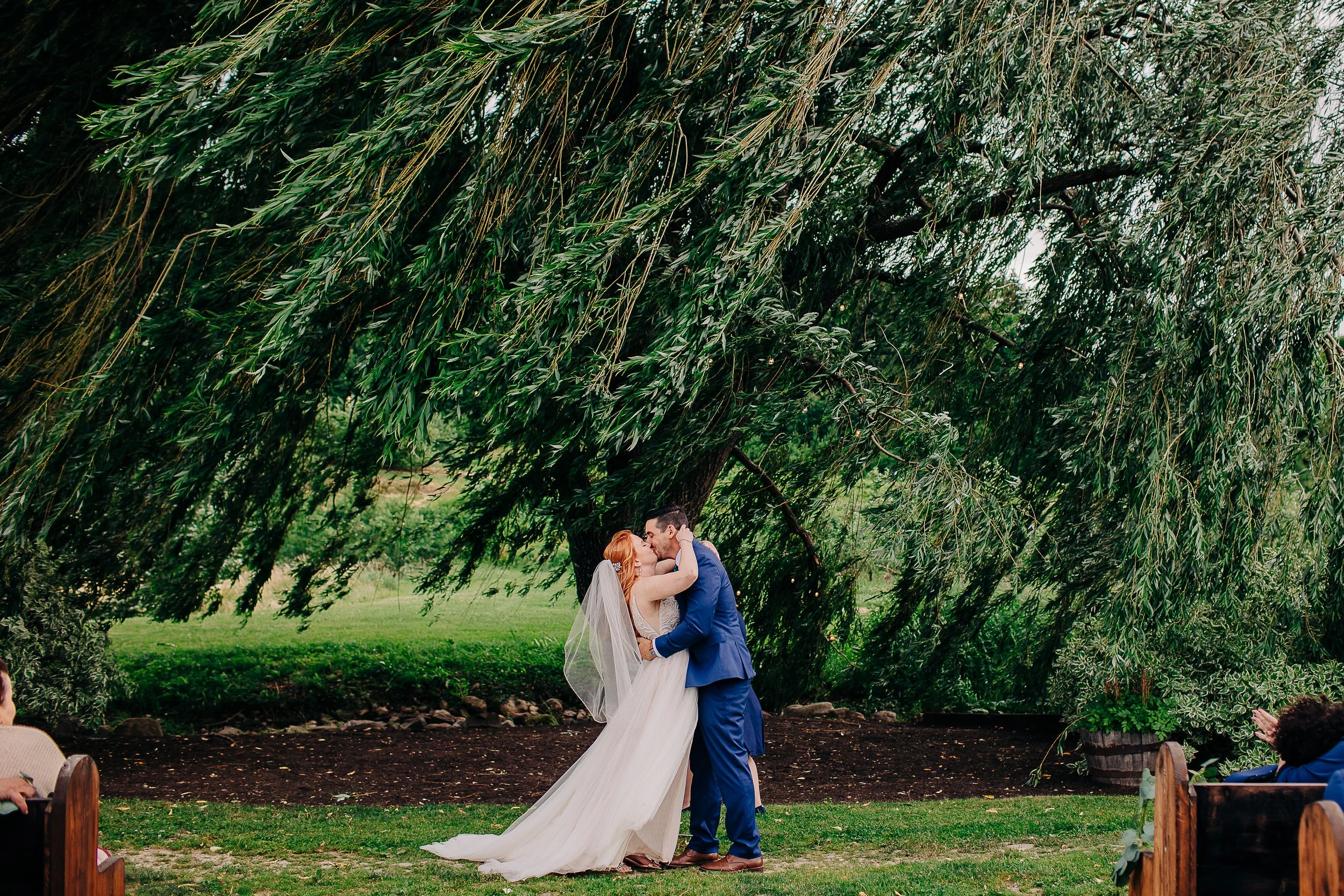 For weddings, it is a beautifully unique space. Most couples choose to get married under the large weeping willow tree, which is such a stunning feature. For the reception, you have access to a steel barn structure - something rare in a region where most barns are historic and wooden. There are plenty of locations for photos on the grounds - the vineyards themselves provide a lovely backdrop, as well as some of the open fields, and the willow tree itself.