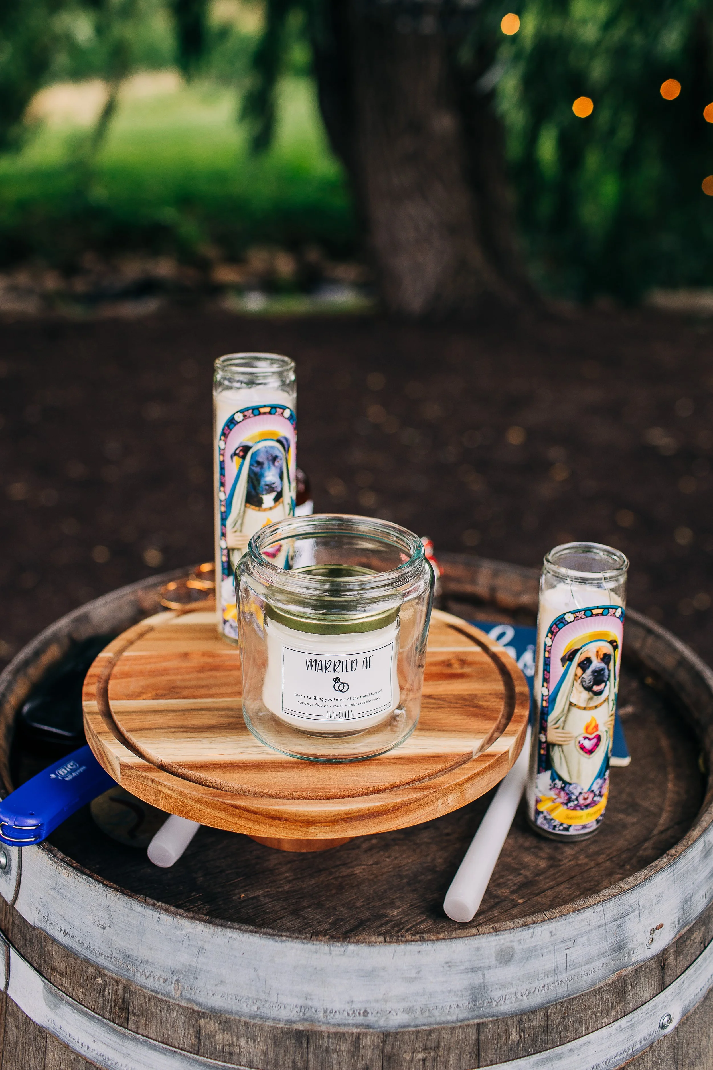 Stephanie and Brian chose a natural yet vibrant aesthetic for their wedding day, with bright florals and gold accents. Brian drew and designed their wedding invitations, which were so gorgeous. The wedding party wore shades of deep blues and greens, and Stephanie processed down the aisle to the Jurassic Park theme song. In memory of her dad, Stephanie added a portrait of him to the stems of her bouquet. The couple also created custom prayer candles that featured their dogs’ faces to include them in the ceremony.