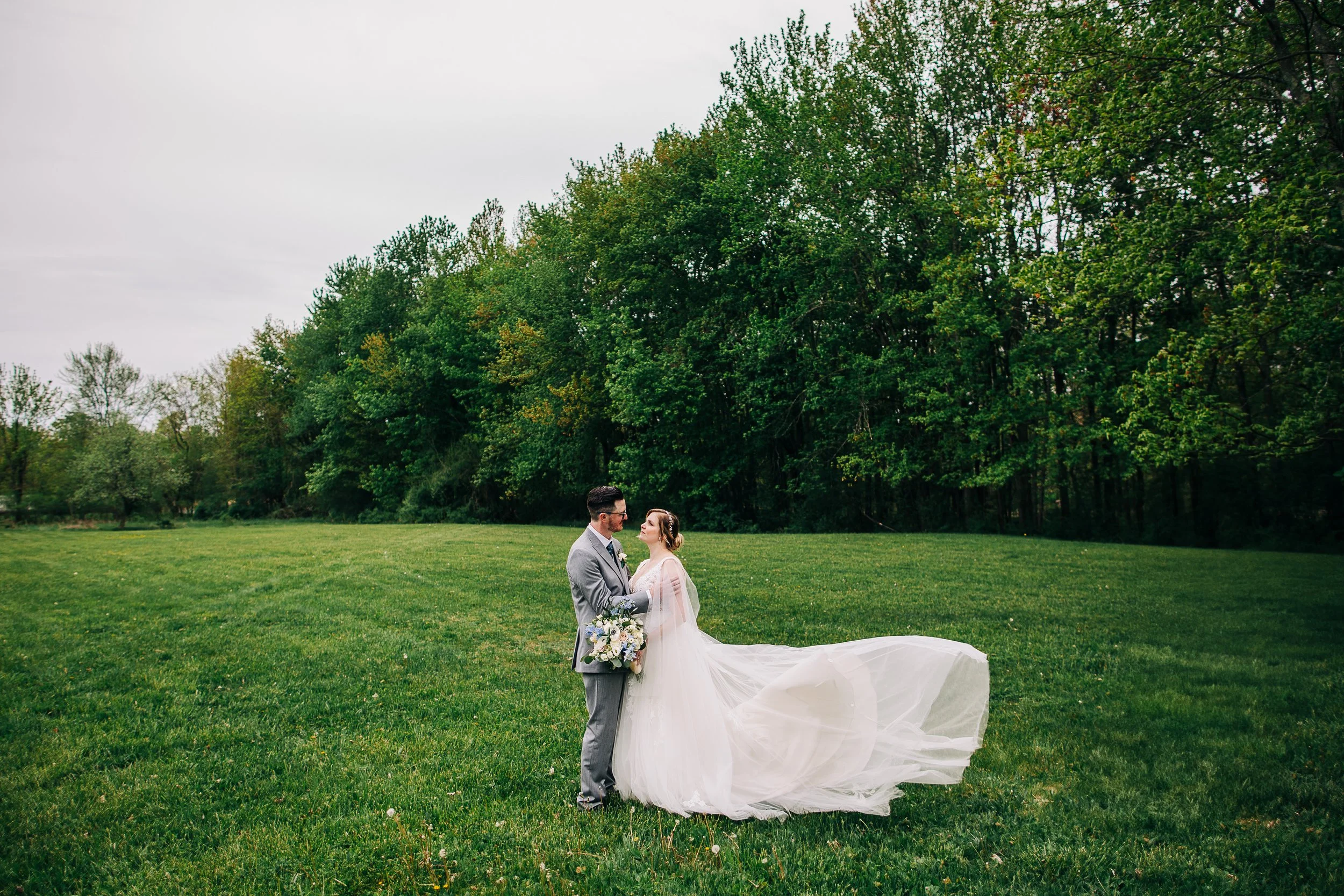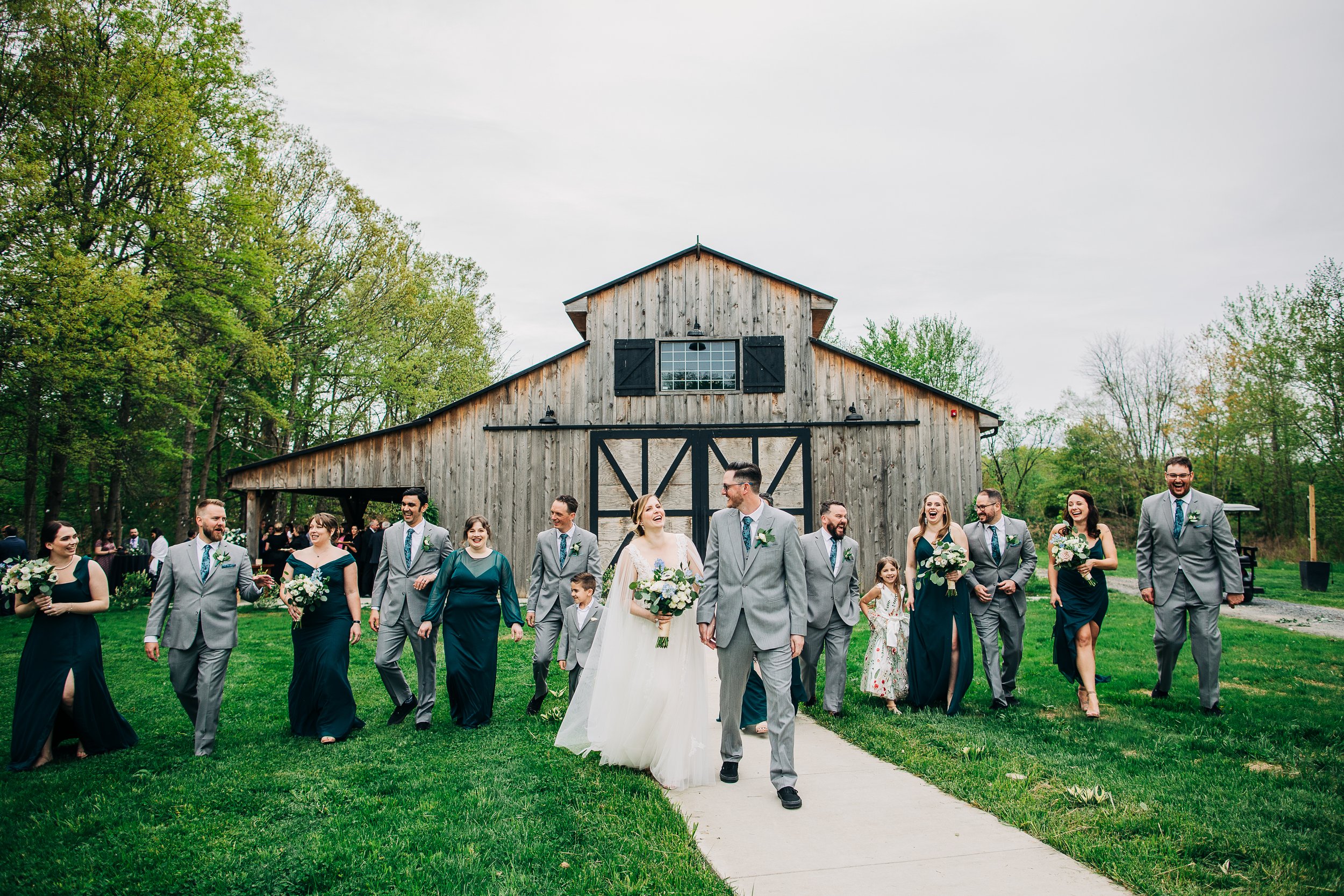 Christine's dress was entirely unique and entirely her. Lace with sleeves that moved like a cape - regal and whimsical at the same time. The wedding party wore dark teal, gray, and blue, which looked beautiful against all the greenery.