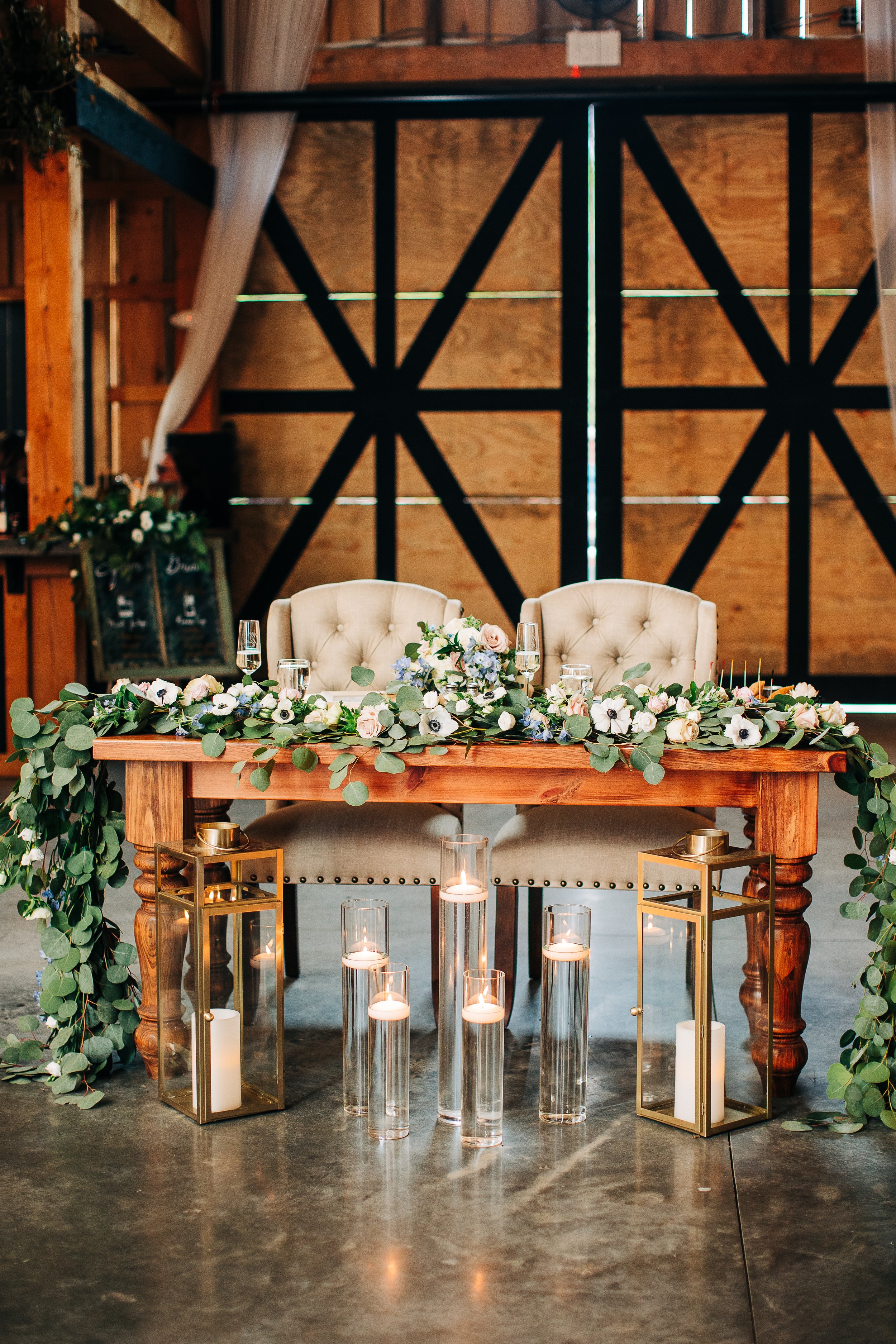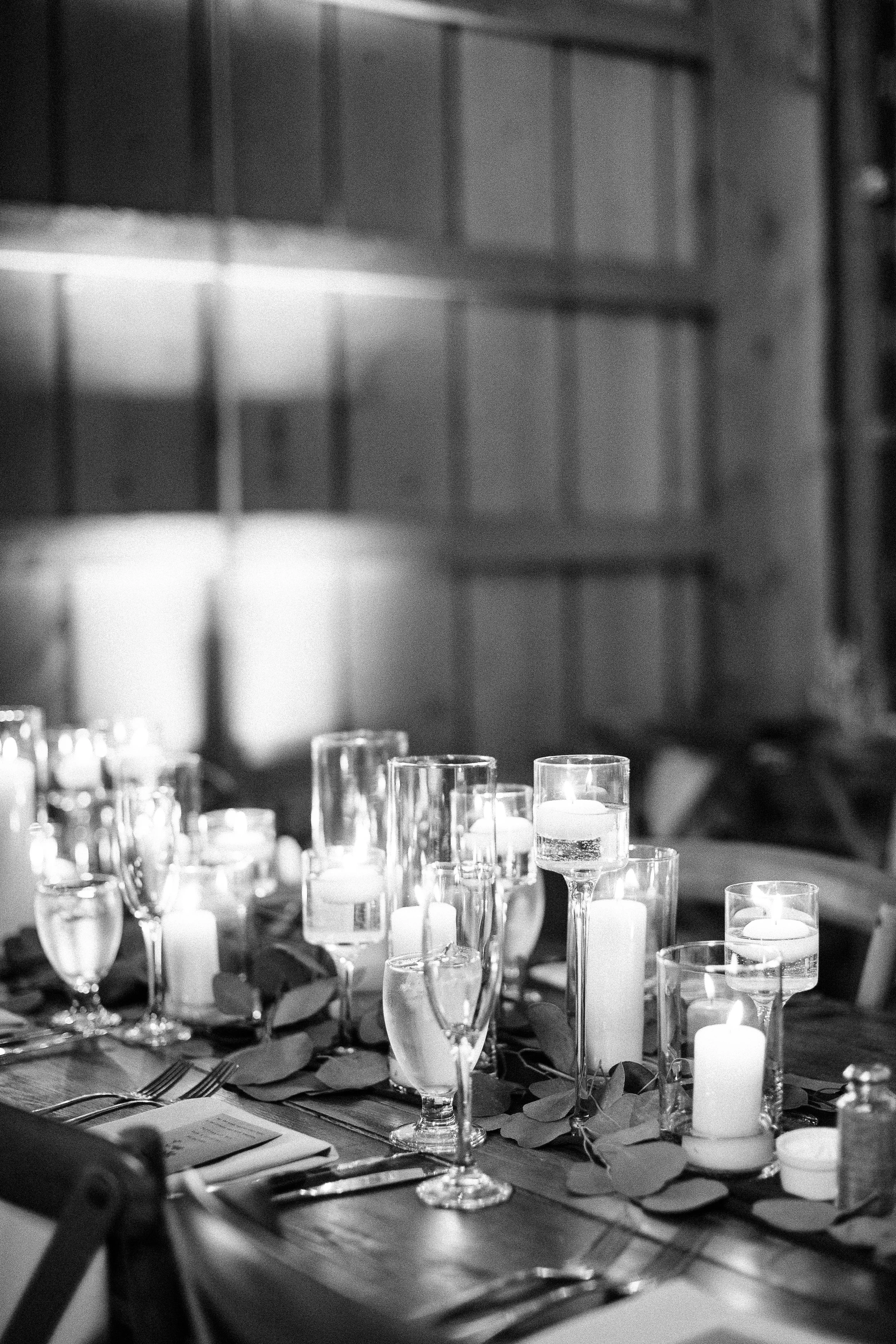 They went for a cozy floral vibe with white and slightly colorful florals mixed with lots of greenery. And candles - candles everywhere throughout the reception. It created this warm, intimate atmosphere even in a bigger space.