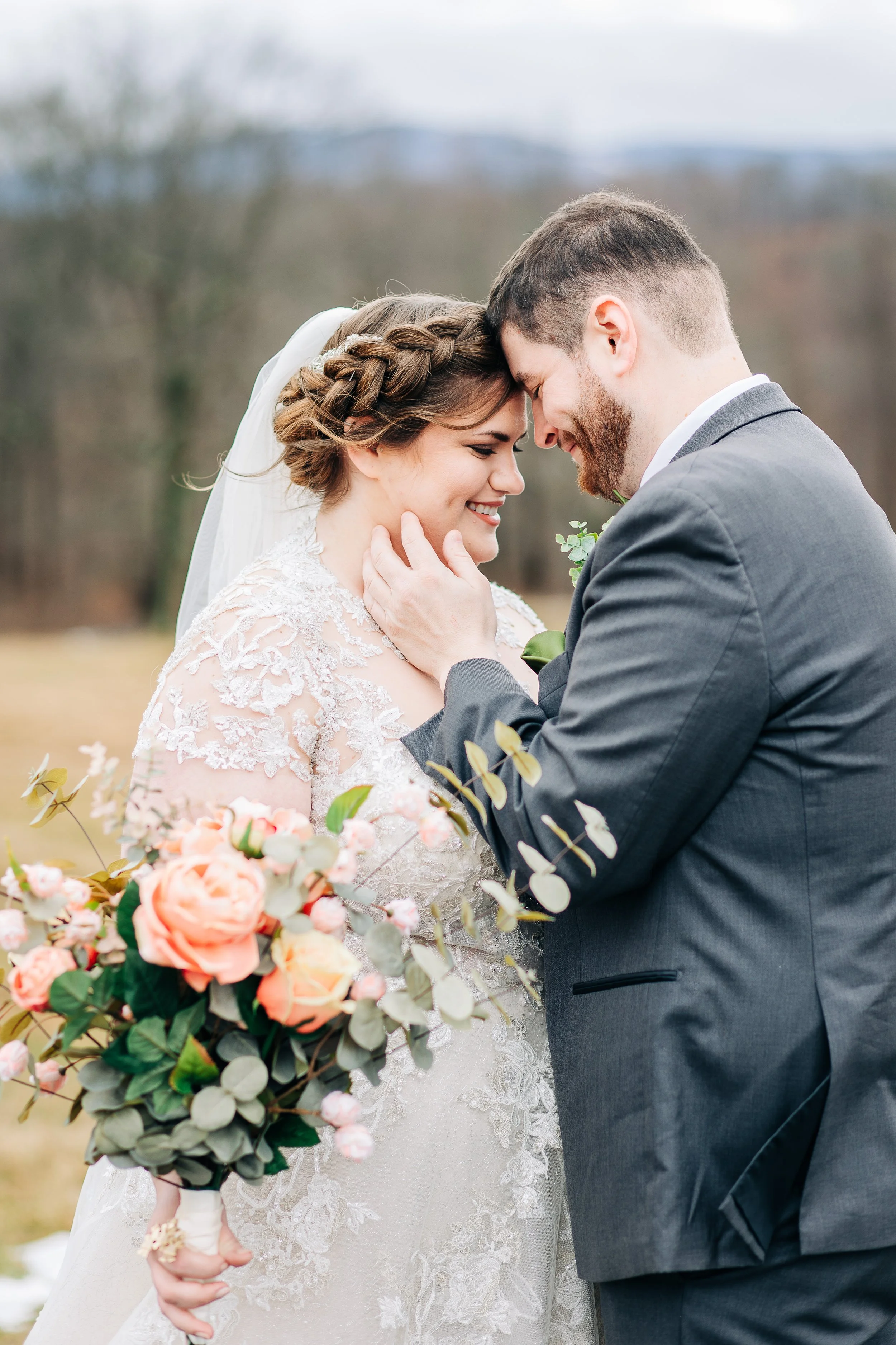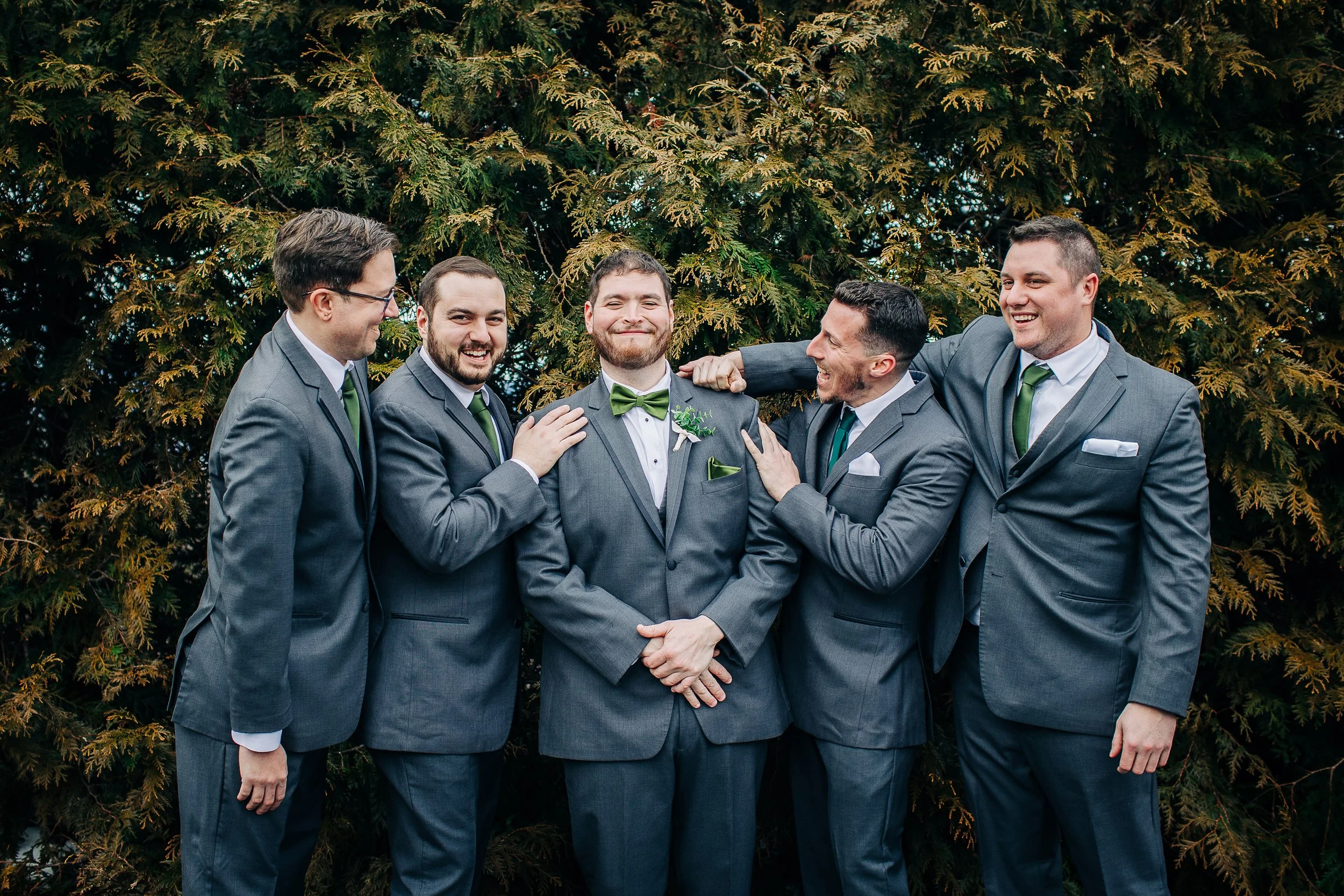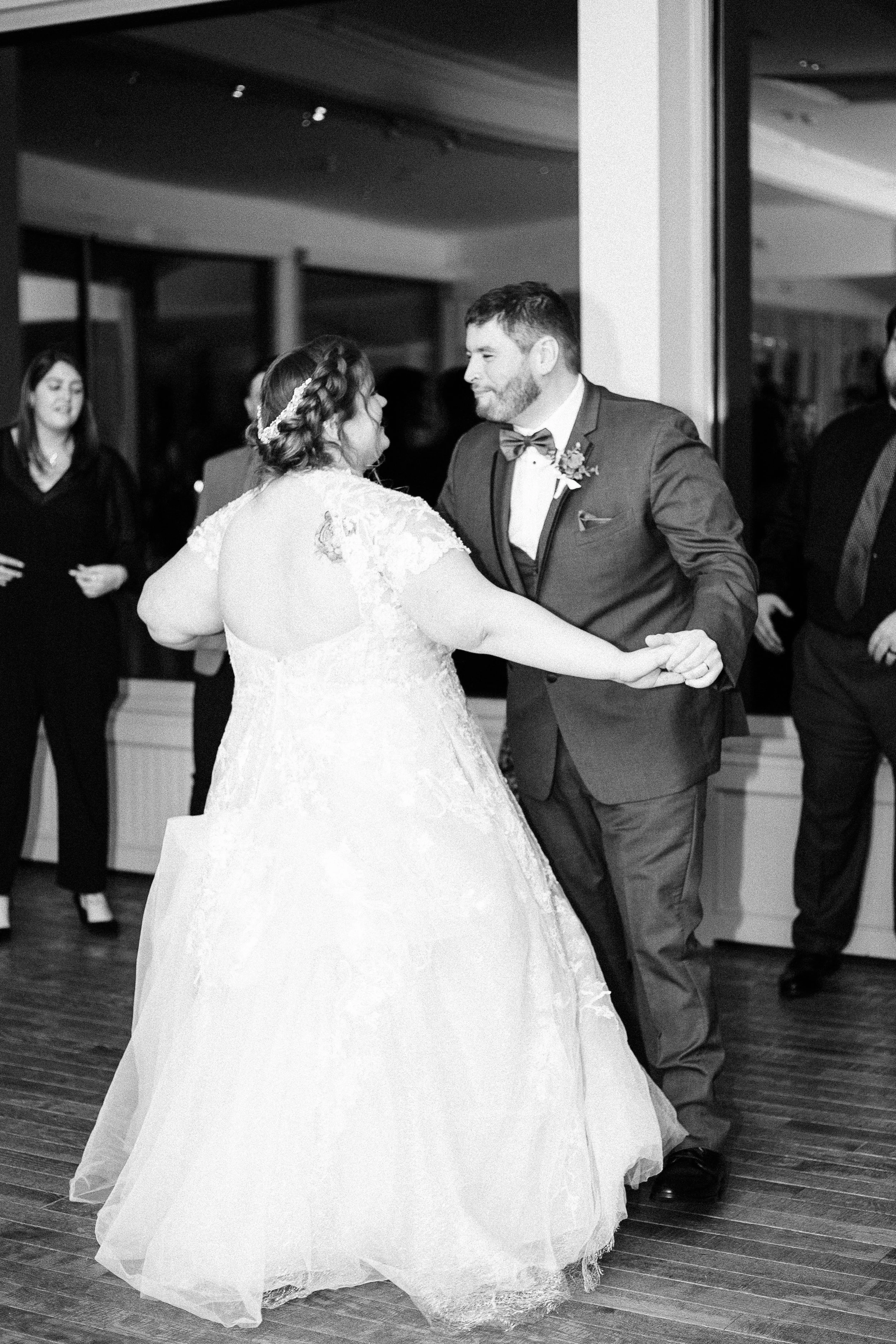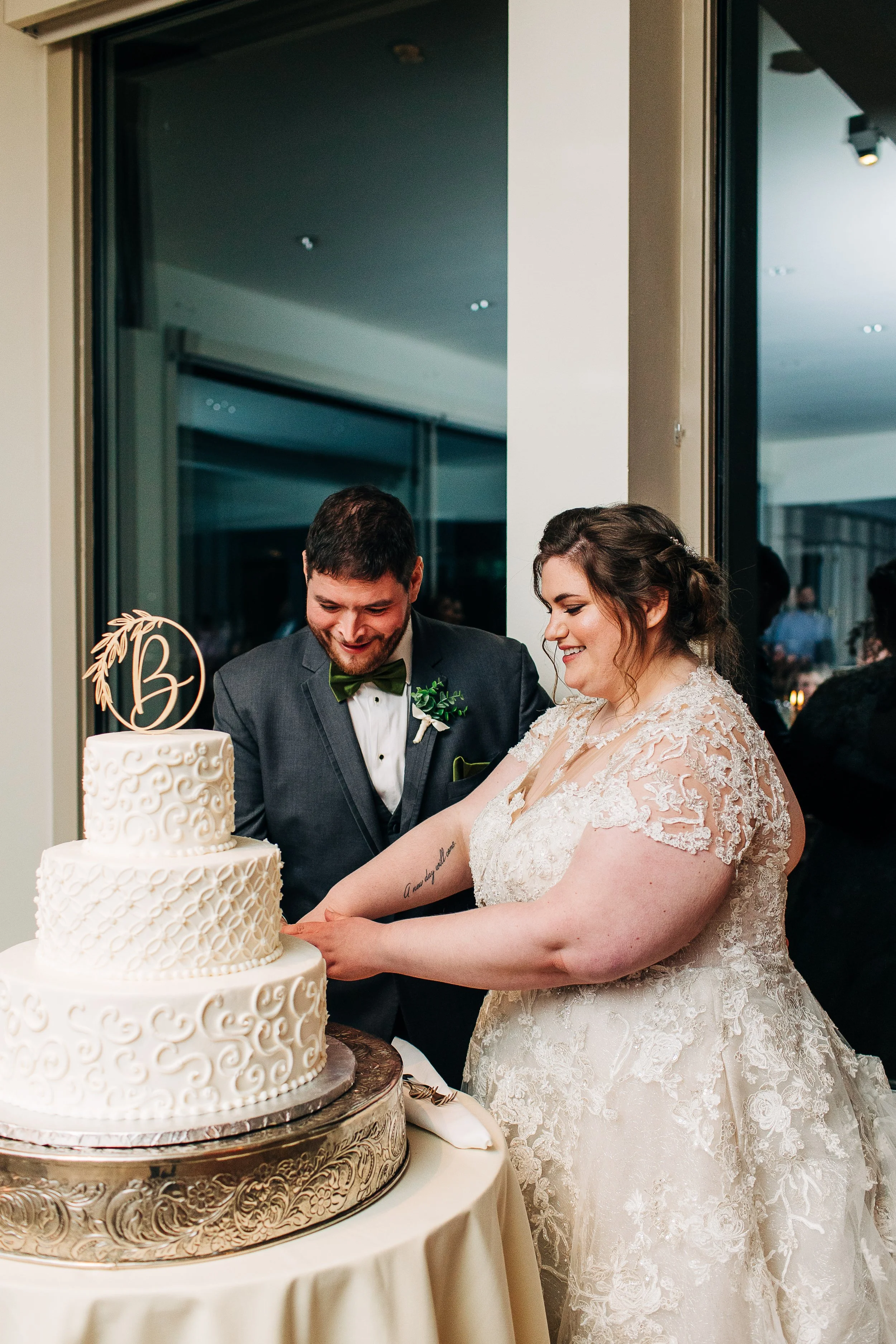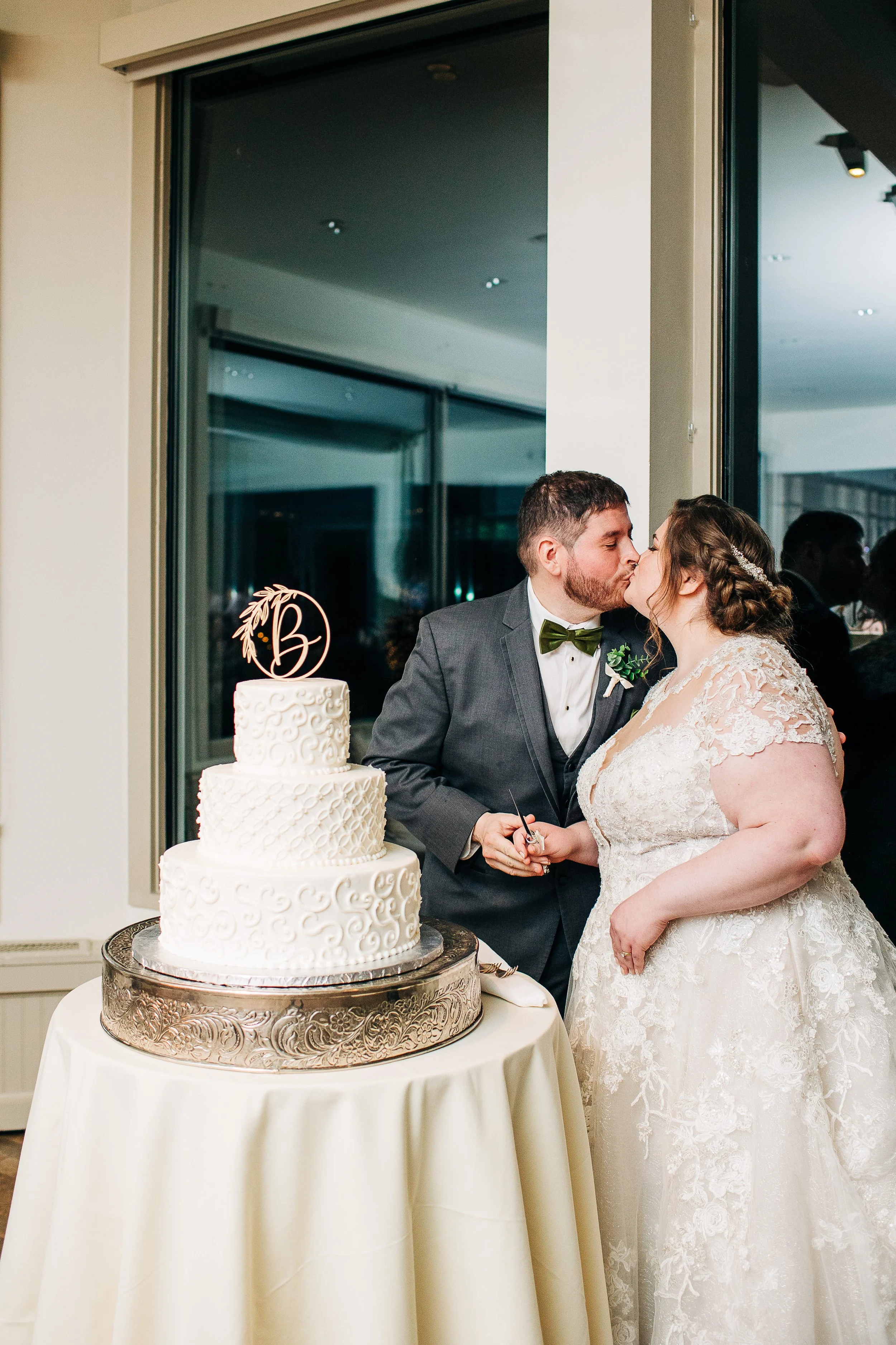 Gina and Aaron kept with a simple, wintery white and green aesthetic. The bridesmaids wore long green gowns, and the tables were decorated with greenery. The groomsmen wore gray suits with green ties; and Aaron wore a bow tie. Gina’s gown was one of my absolute favorites, featuring a full skirt and lace cap sleeves - perfect for winter!