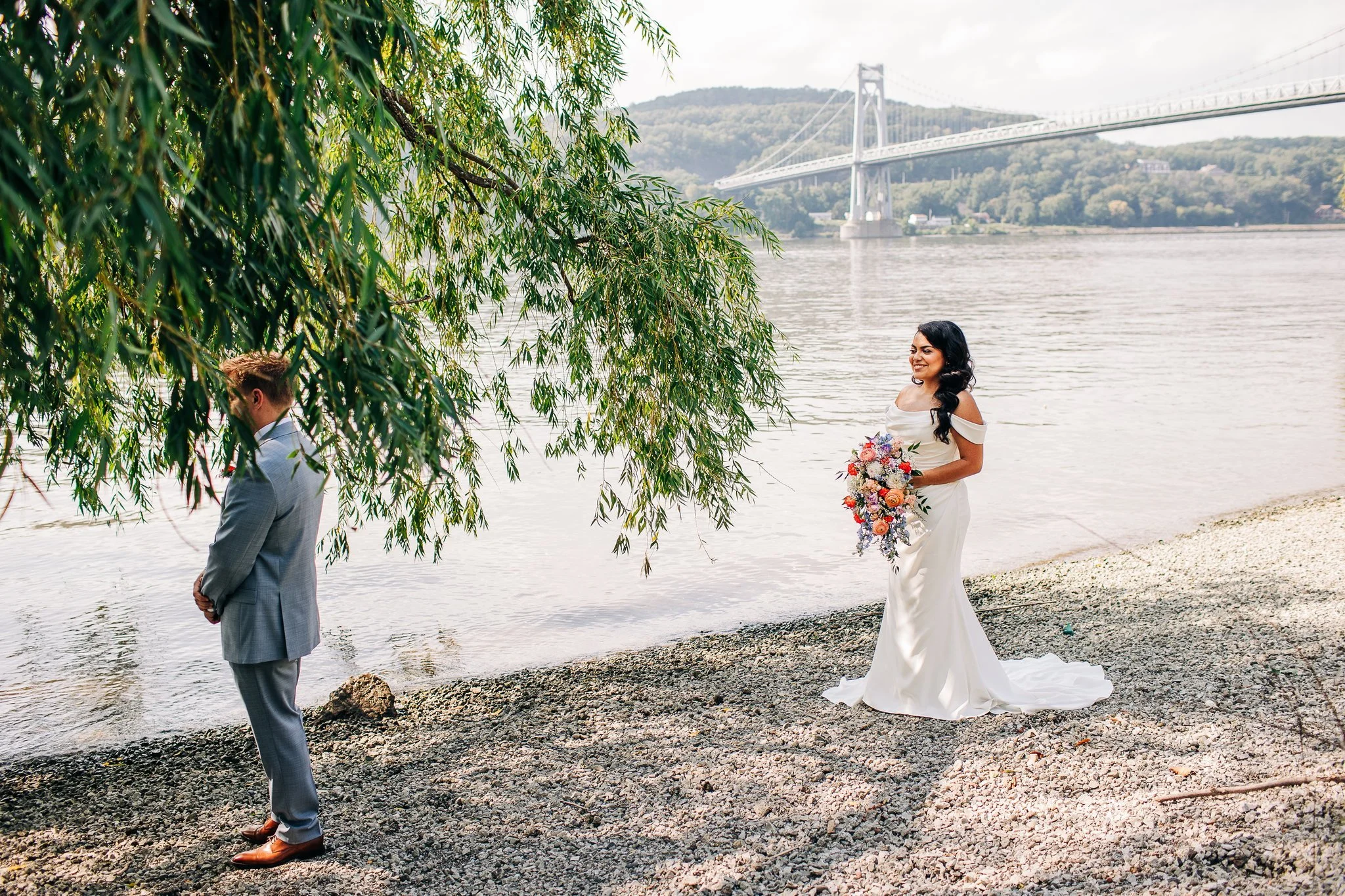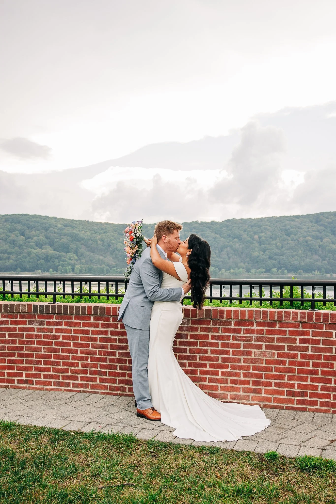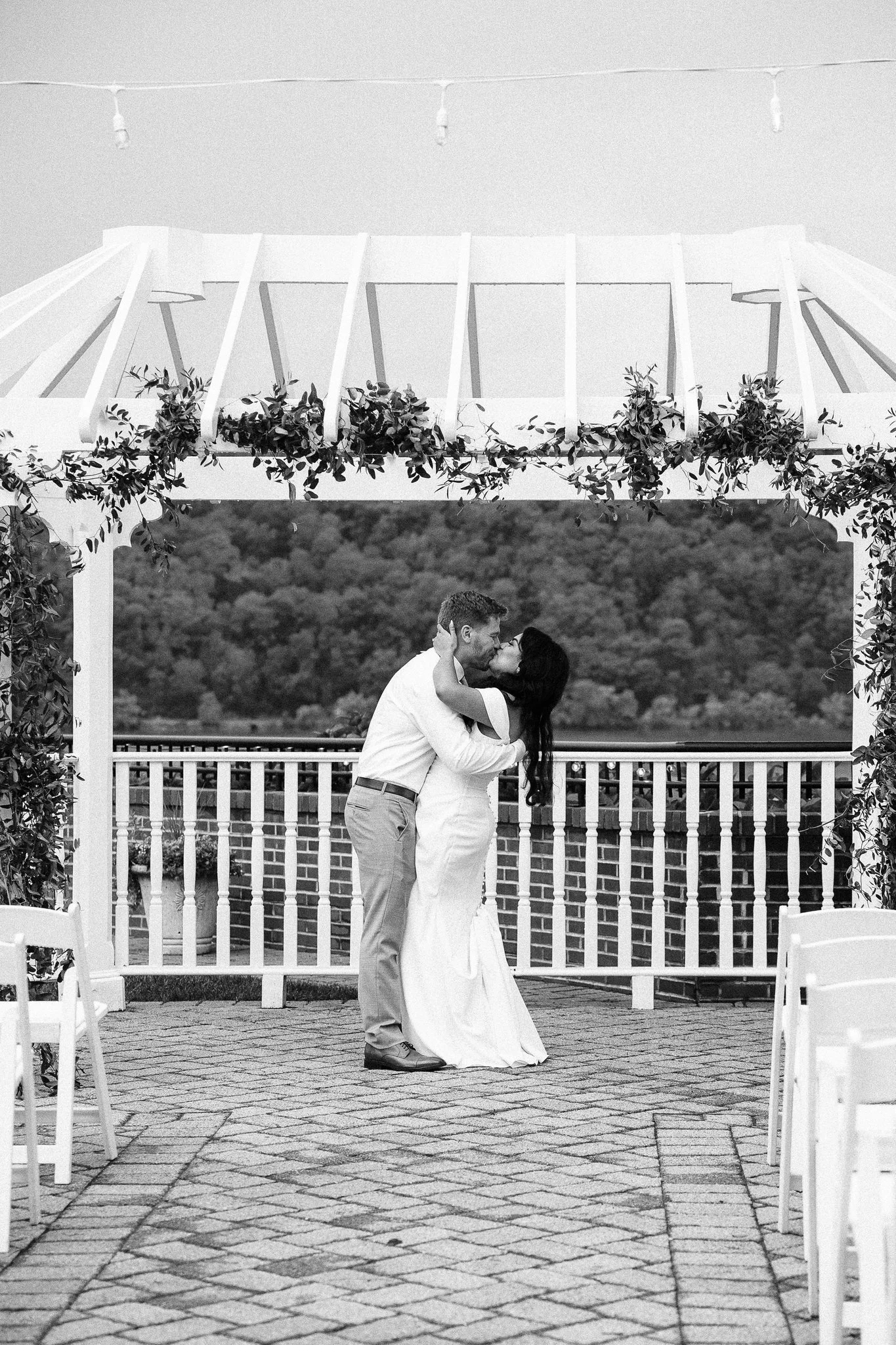 The Grandview in Poughkeepsie, NY boasts two different locations to host your ceremony and subsequent reception - both ceremony locations are outside, but you can choose to host your reception in either an indoor ballroom or outdoor tent. Swami and James chose to host their wedding on the tented side of the venue, and although they originally planned to have an outdoor ceremony, a quick-moving thunderstorm moved them inside. But before this happened, they were able to take some beautiful photos near the water and in the space surrounding the outdoor patio.