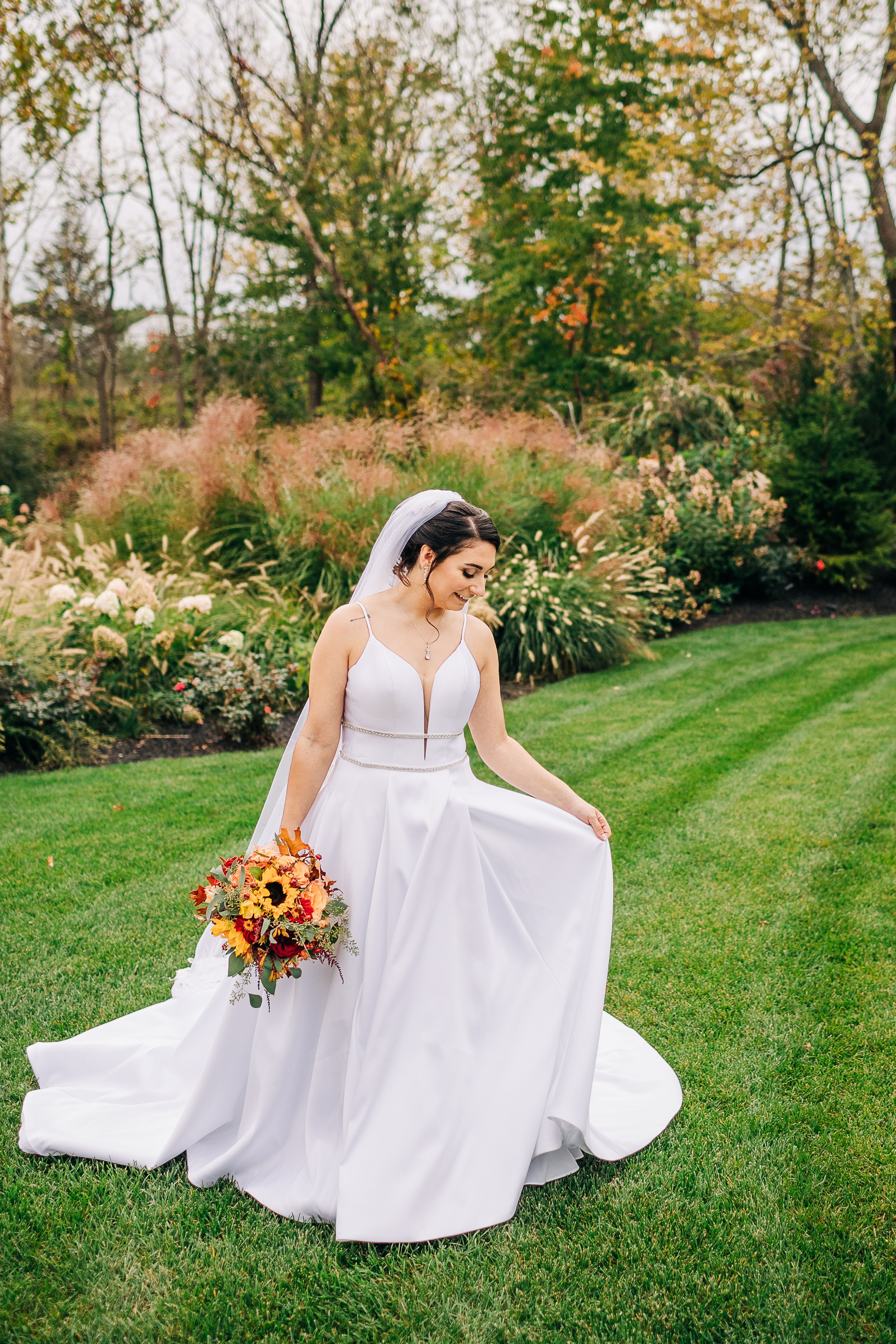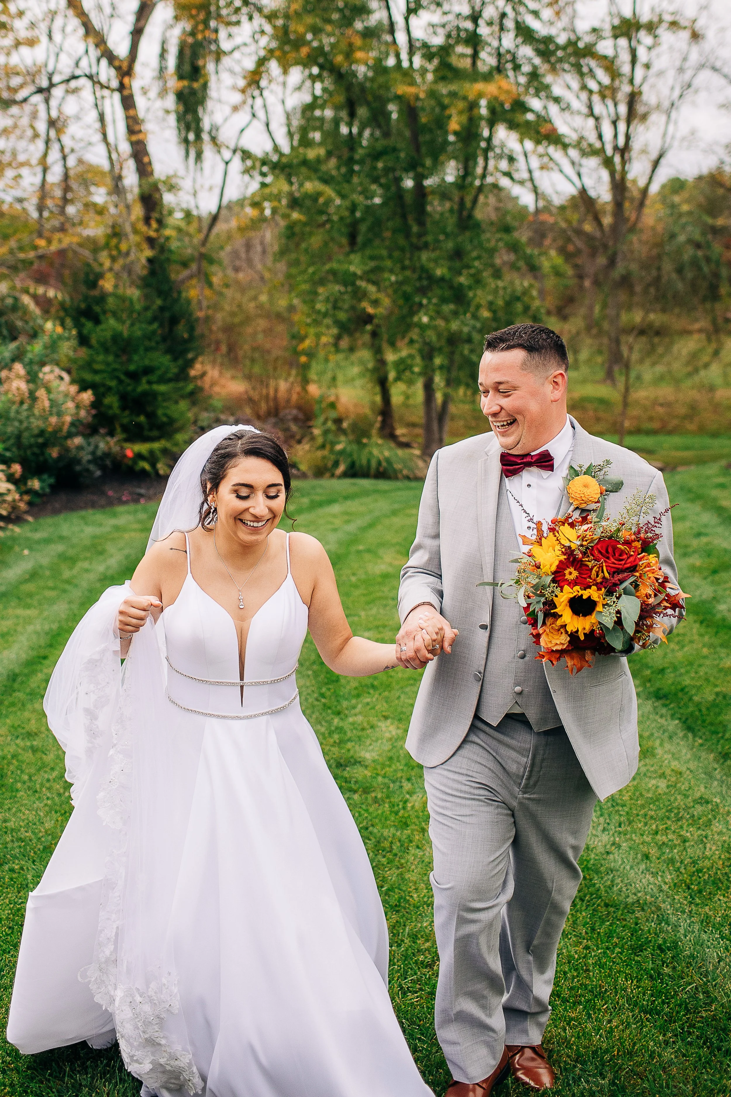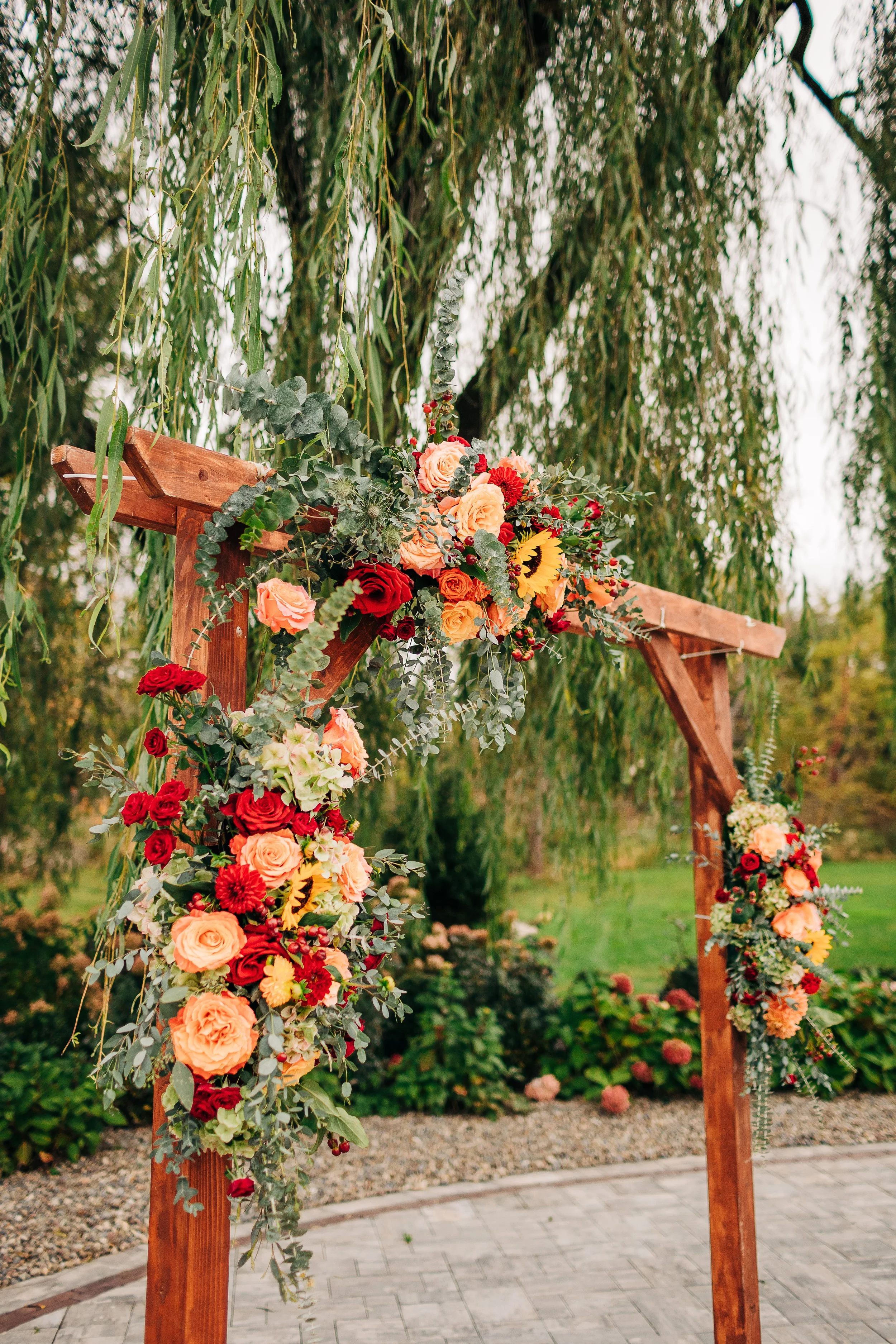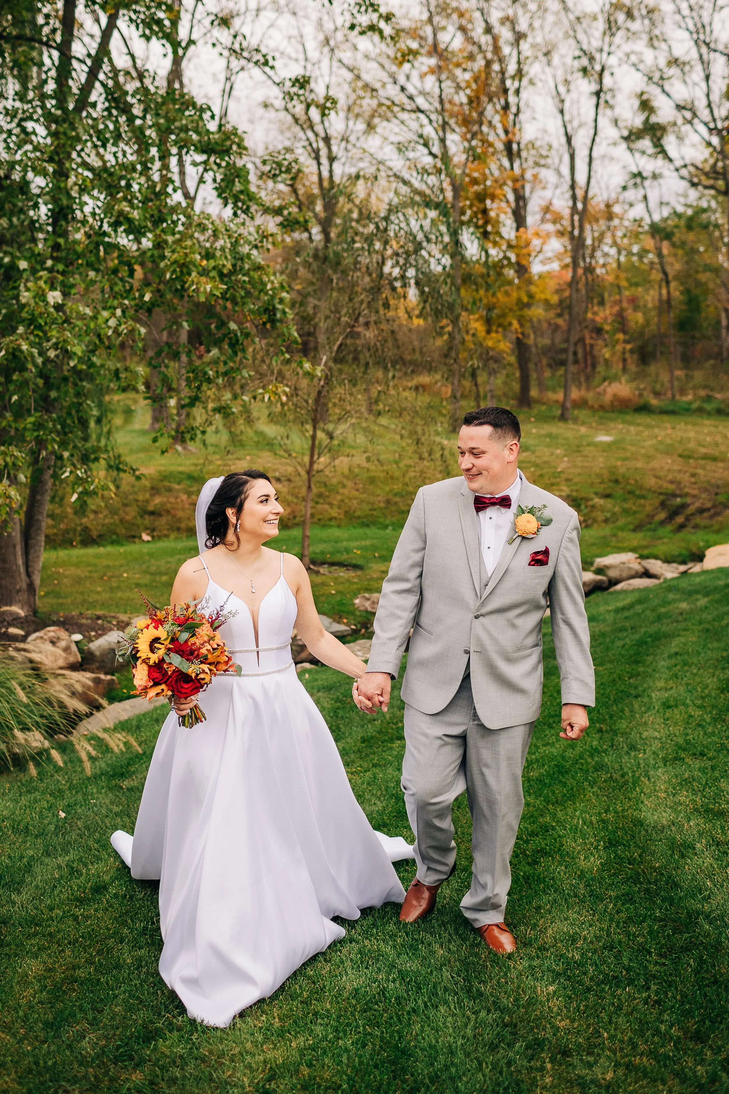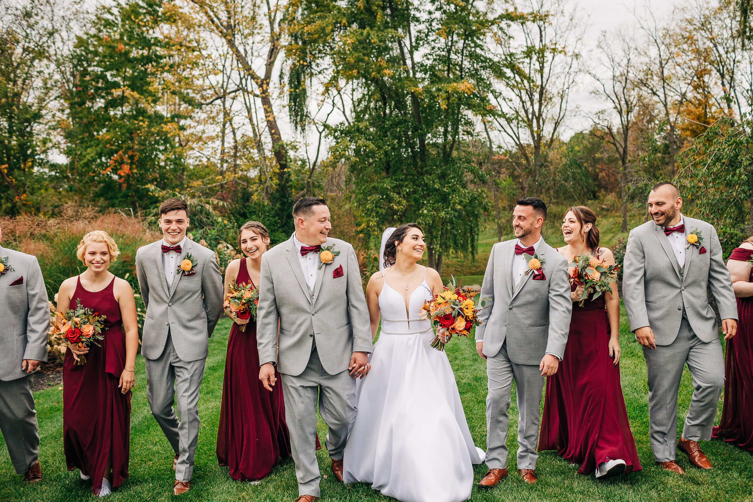 Alyssa and Jordan chose a warm fall aesthetic for the details of their wedding day, with florals including sunflowers and bursts of red, and the wedding party wearing shades of gray and burgundy.