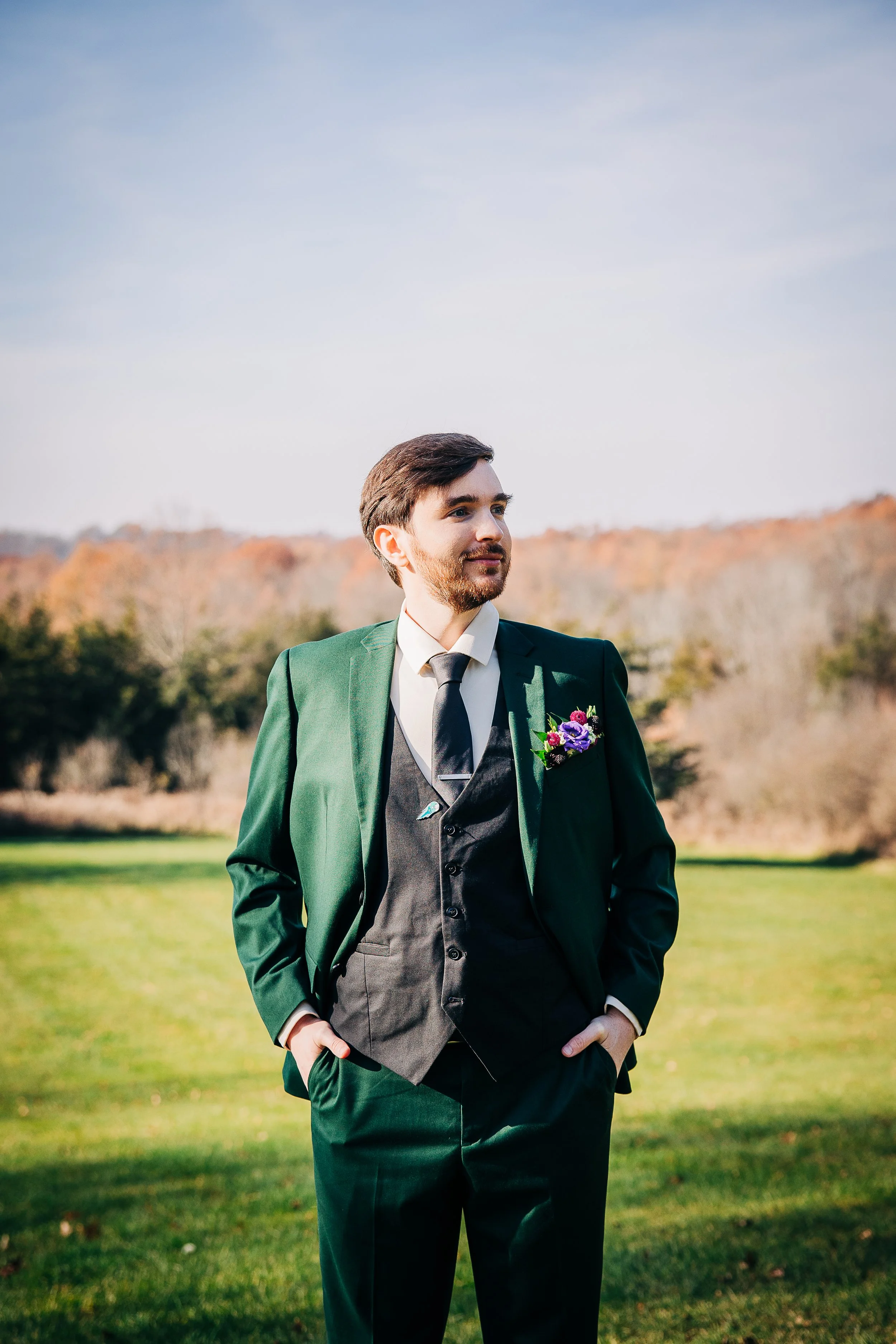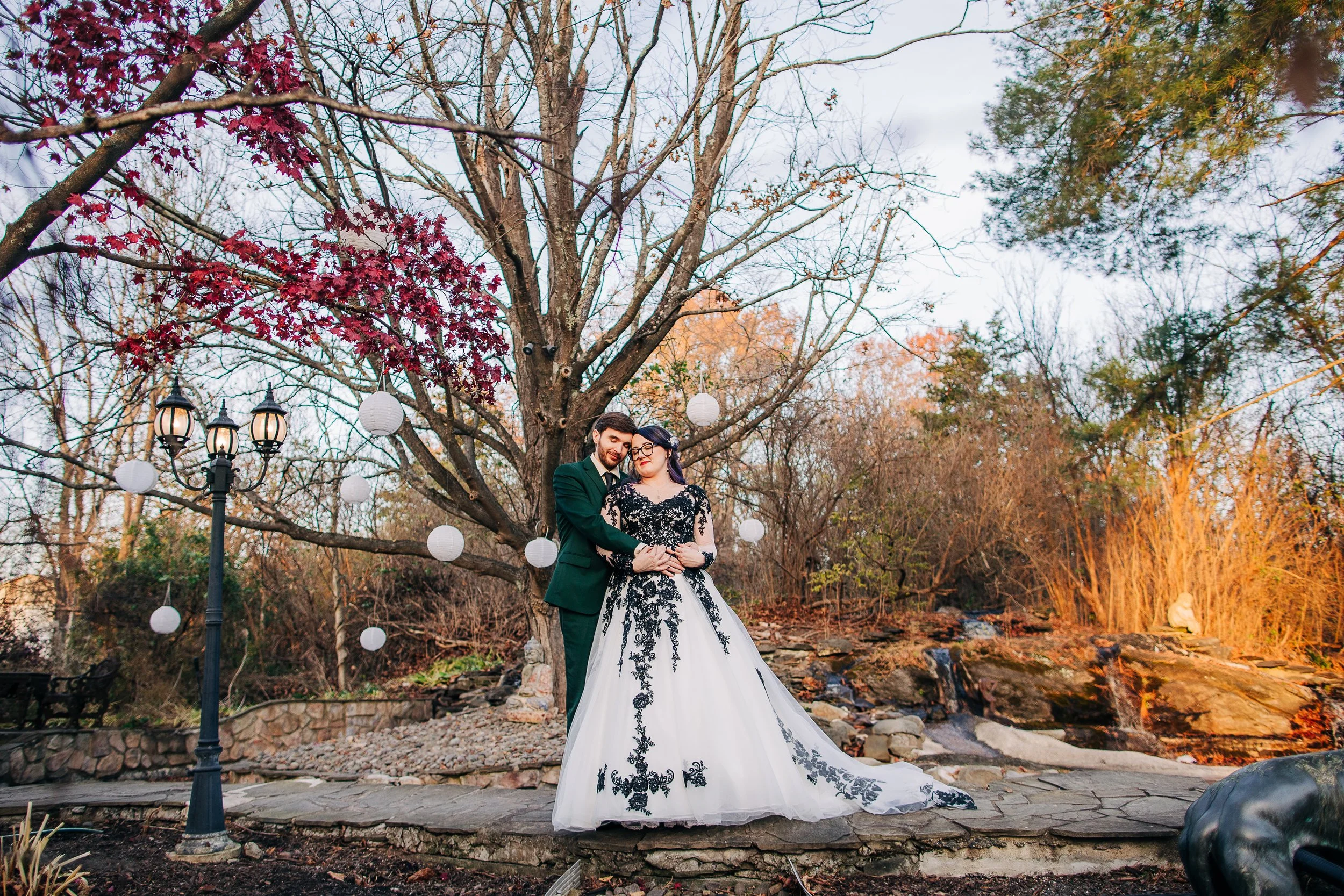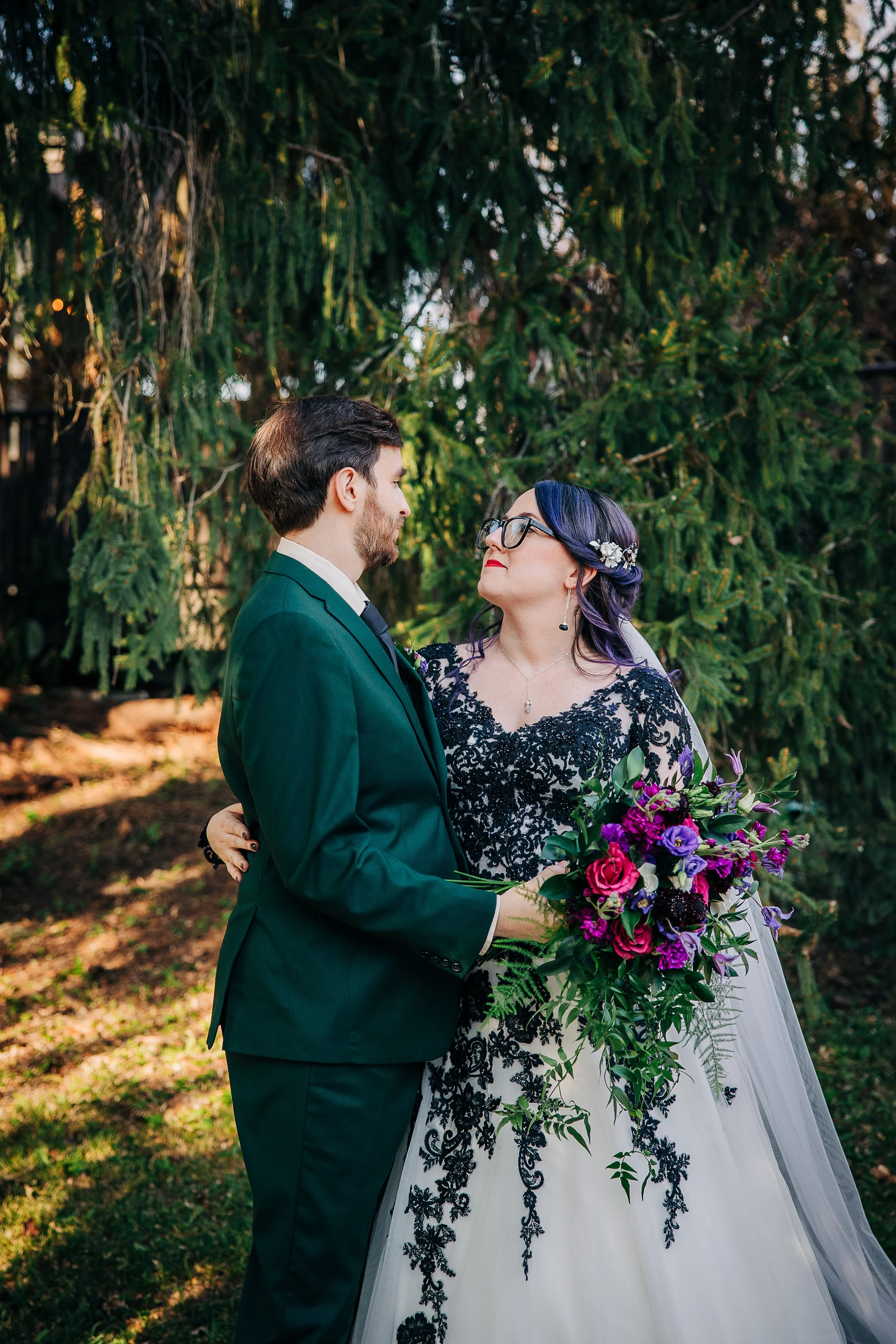 Angela’s dress, a white gown with a black lace overlay, was the perfect choice for her. Sean’s deep green suit tied in perfectly with their colorful palette of greens, purples, and fuchsia.