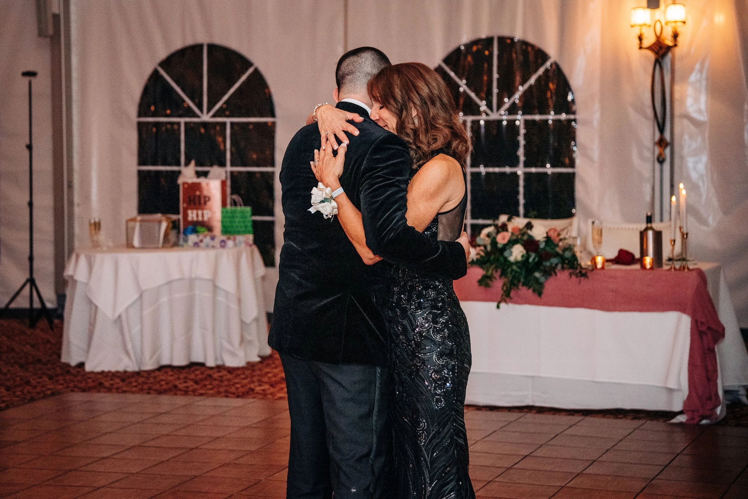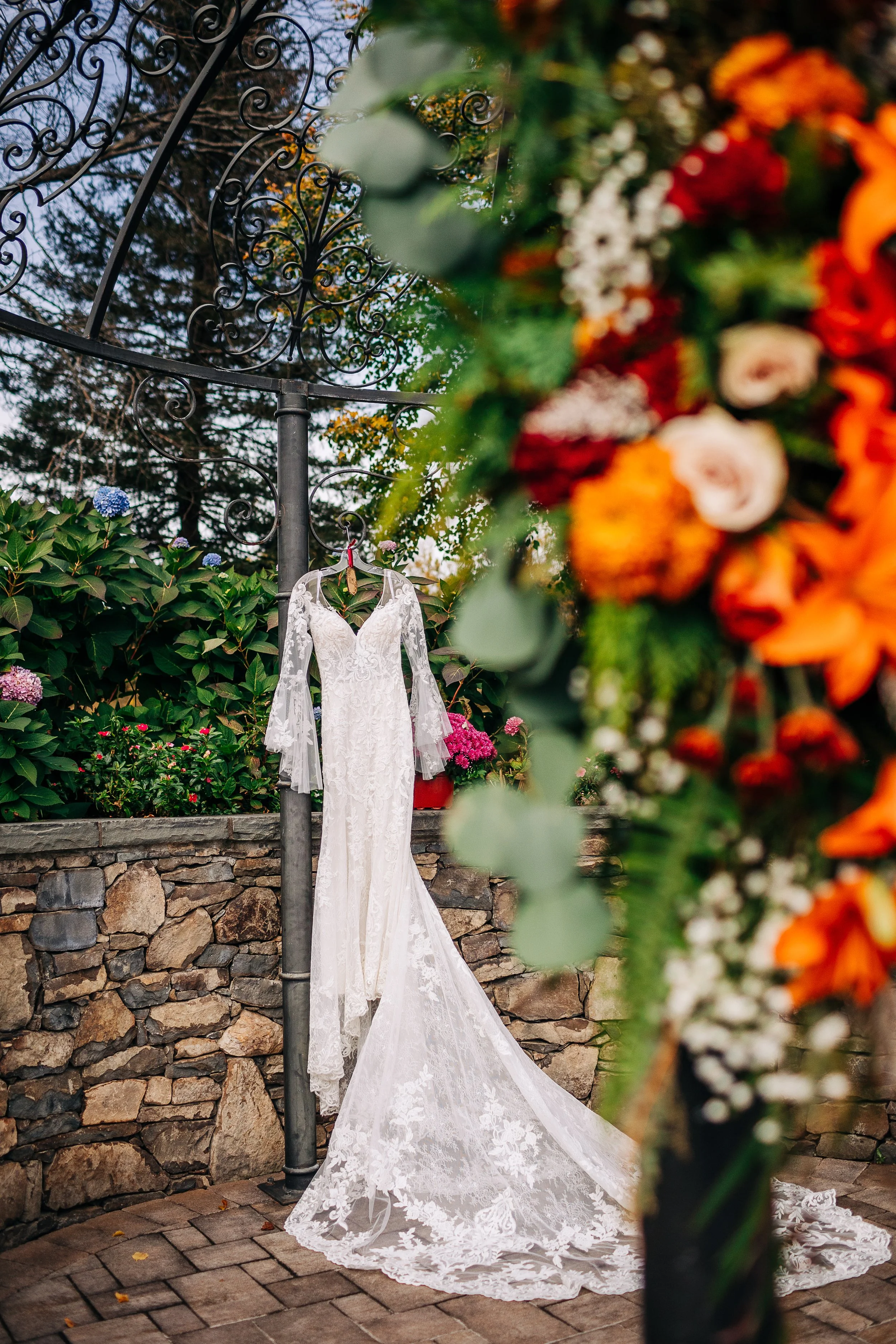 I won’t lie and say that the perfectly peak foliage wasn’t THE most beautiful detail of the day (I mean, the photos are clear proof), but, honestly, all of the details from Nicole and Matt’s wedding were just gorgeous. The bell sleeves on Nicole’s lace Madison James gown. The velvet on Matt’s suit (!!!), and loafers as his choice of footwear. The warm pink, wine, and black color palette for the wedding party. Everything was just absolutely stunning - the most ideal for a late October wedding day.